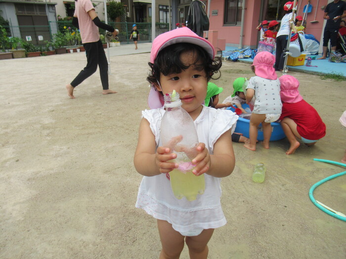 夏本番となりました! 水遊びが大好きな子どもたち☆ 絵の具での色水遊びでは、色を混ぜて色の変化を自然に発見していますよ。 また、シャワーの水を頭から浴びてダイナミックに楽しむ子もいますよ~☆ | ||