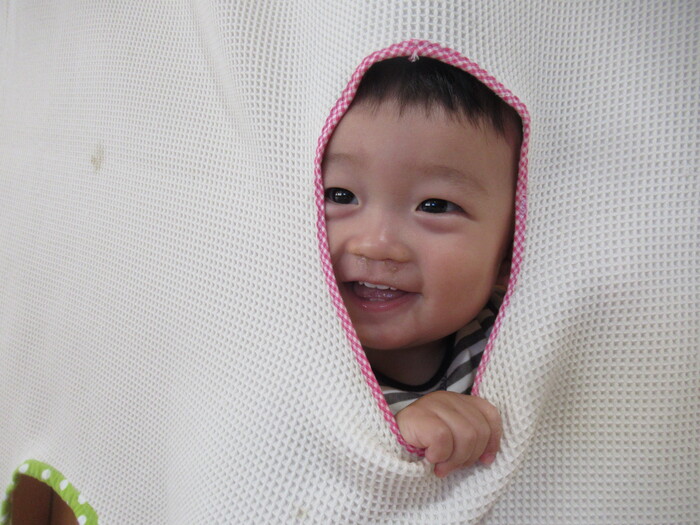 広ーいゆうぎしつで体を思いきり動かして遊んだよ!! 布から『いない、いない、ばあ』をしたり、階段を上って、 段ボールすべり台をすべったり、クレヨンを握ってお絵かきも 楽しめるようになりましたよ♪ | ||