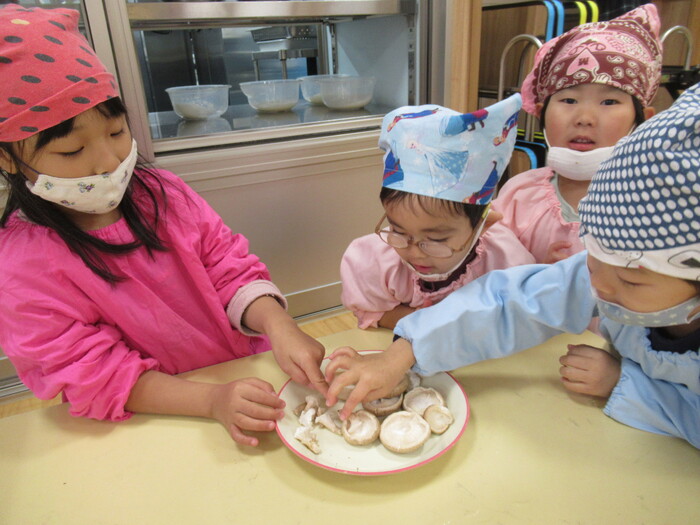 おたすけレンジャー参上‼ (給食の先生) 『しいたけのじくをとってほしいな!』 (Tちゃん) 『じくって何?どこのこと?』 さぁ、椎茸さんがどうなったかは 想像におまかせします(笑) | ||
