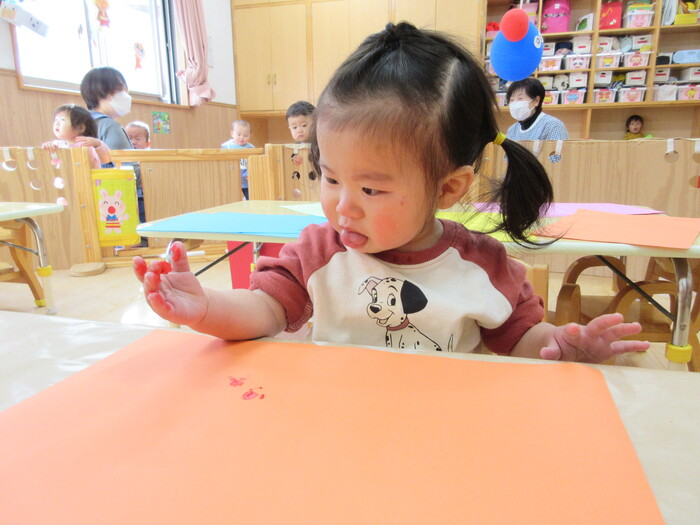 フワフワ、風船あそび🎶 手をいっぱいに伸ばして、つかんだり、引っぱったり、ぽーんと叩いたりしながら楽しんでます!! | ||