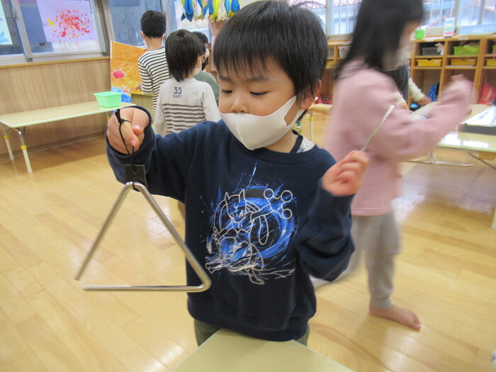 鉄琴、木琴、トライアングルなど 楽器遊びを楽しんでいます♪ カエルのうたやきらきら星などにも 挑戦していますよ!! | ||
