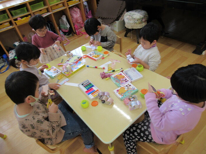 もうすぐひなまつり♪ 今年は年長年中にわかれてひなまつり製作をしました。 年中さんはのりの使い方が、年長さんは手先がとっても器用になりました。 楽しく作る子どもたちの姿を紹介します。 | ||