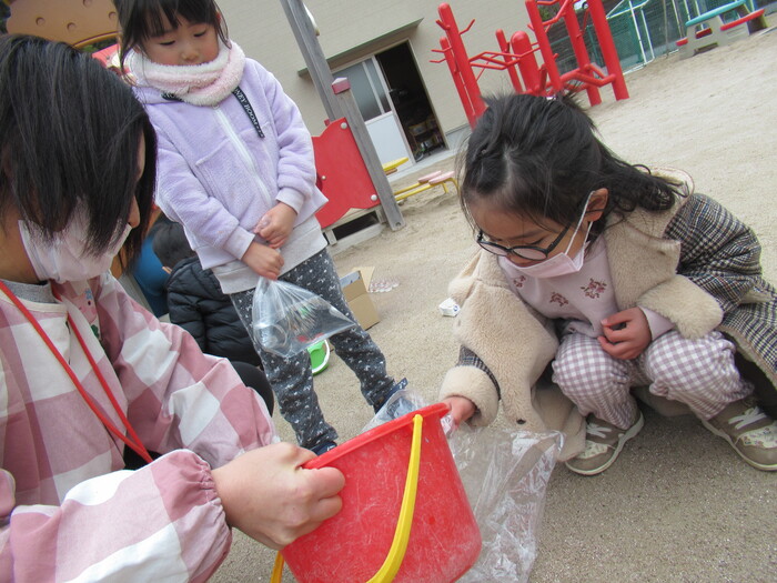 冬の氷遊びは子どもが氷ができる理由や特性を知り、 冬の季節を感じられる活動の一つです。 実際に氷づくりを経験することで、 氷の感触や冷たさや特性を知ることができました。 冬の遊びを通して、また一つ学んだまんぼう組さんでした☆ | ||
