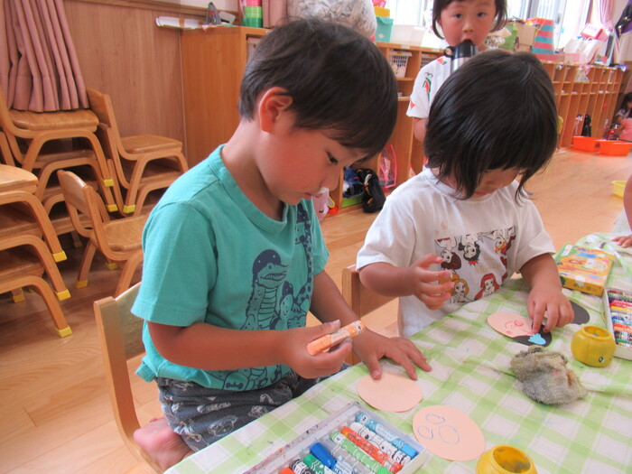 もうすぐ七夕!クレヨンでおりひめ様、ひこぼし様の顔を描いたり、のりを使って髪の毛や飾りを貼って製作を楽しみました♪完成した顔は、いろいろな表情がありとても素敵な作品になりました(^^♪ | ||