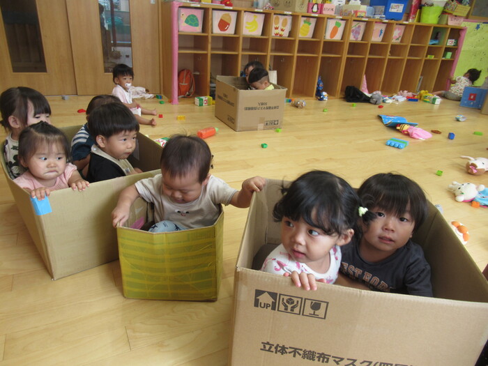 ↑ 大きな段ボールにみんなで入り「いっしょ~」と言ってキャッキャッと喜ぶ姿が見られました。 入りたいときには「い~れ~て~」と保育者と言って、お友だちと言葉のやり取りをしていますよ♬ | ||