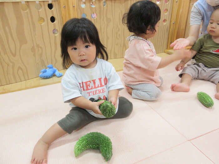 新しいお友だちも増え夏を満喫しているめだか組さん! いろいろな物を触って感触あそびも楽しみました。 子どもたちの新しい触り心地を味わう表情をご紹介します🎵 | ||