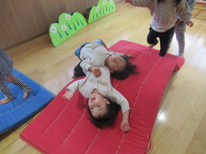 みんなで参観日のときに楽しんだアスレチック広場で遊んだよ! 「遊戯室に遊びに行こうか!」と伝えると、「やったー!!」「行く行く!」と 大喜びな子どもたちでしたよ♪ 子どもたちだけで順番に並んで待ったり、遊びが発展して色々な遊びを友だちと楽しんだりと そんな子どもたちの姿を見て成長を感じました(*^^*) | ||