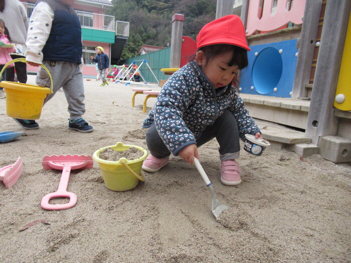 冬の訪れを感じ、外もめっきり寒くなりなしたね。 日差しがあり気温が高い日には、「待ってました!」というように張り切って園庭へと飛び出していく子どもたちです!最近は、おままごと遊びの中で、「○○ちゃんどうぞ」「おちゃちゃだよ」などお友だちの為に作ってあげる姿が見られるようになりました。 乗り物も大好きで、「何して遊ぼうか?」と聞くと、「ブーブー!!」と元気な声が返ってきます♪ | ||
