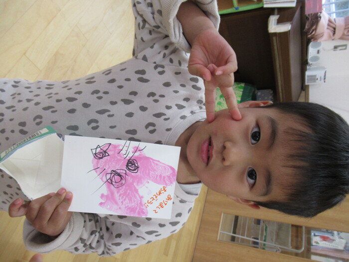 可愛い年賀状は届きましたでしょうか?? さつまいもの切った断面に絵の具をつけてうさぎを表現しました♪乾いてから可愛いお顔も描きました♪ | ||
