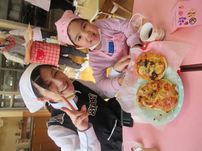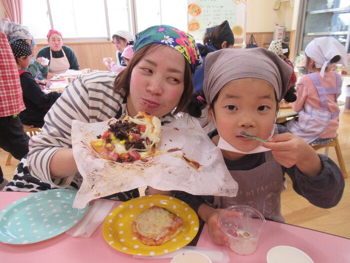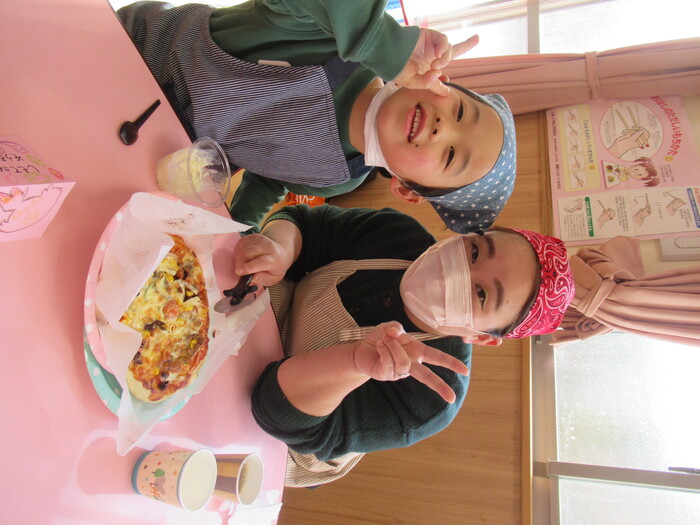 ふれあいクッキング~☆ 年長さんが親子でピザ作りをしました! 子どもが午前中生地をコネ、午後からは みんなでトッピング~♡ どんなピザができたかな!! | ||