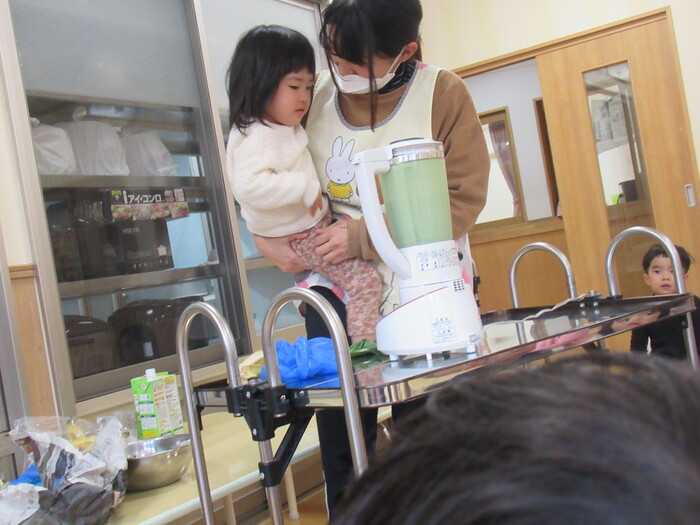 今日のおやつはスムージー!! 作ってくれるのは給食の先生♫ どんなお味になるのかな? | ||