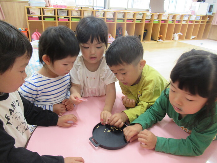 おおきくな~れ! 人参やねぎを水につけて観察したり、 プランターにいんげん豆の種を植えました! 名前は…いんげんまめのすけ! 毎日当番を決めてはりきって水をやったり 水をきれいに変えてくれたりしてくれてます! | ||