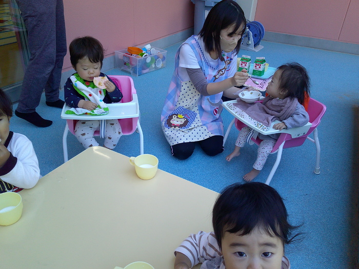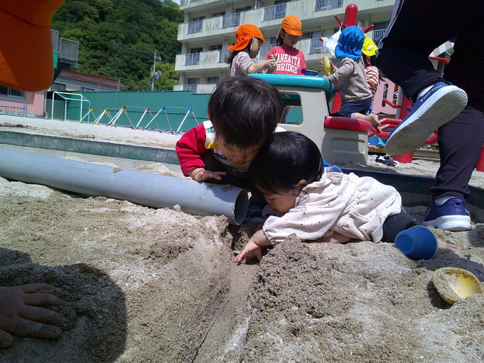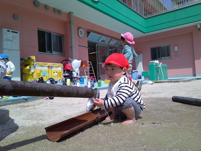 天気のいい日には外に出て遊びました。大好きな遊具で遊んだり、暑い日には水に触れてみました。タライの水の中に砂を入れて音や色が変わることを楽しんだり、流れてくる水を一生懸命捕まえようとしたりと可愛い姿がたくさんありました。 | ||