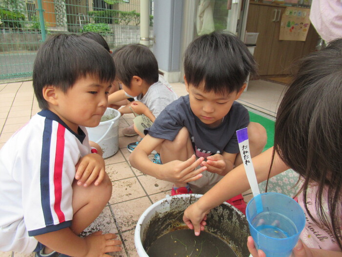バケツで稲を育てよう‼ バケツ稲の話をすると、去年育てたことを思い出し、『やりたい!』とはりきってお世話を始めた子どもたちです。 | ||