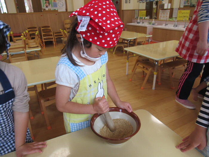 給食室のお手伝いもはりきってしています! 『今日の給食のお手伝いをしてくれる人いますか~?』と言うと、『は~い!した~い!!』と元気に返事が返ってきます(*´▽`*) | ||