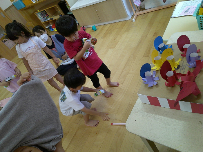 少しですが夏祭り体験もしました♪ おばけ屋敷では「こわいよ!」といいながらも,チャレンジする子どもが多かったです! 射的も大人気でした☆ヨーヨー風船も,もらえて満足した様子の子どもたちです😊 | ||