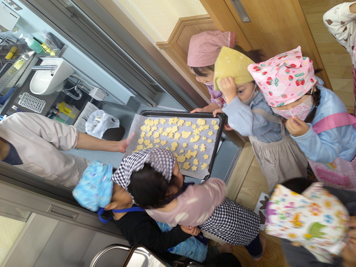 第3回クッキングはクッキーを作りました🎵 初めてのエプロンを着てのクッキングでウキウキワクワクの子どもたち、はりきって作りました☆ 「手を洗ったらもうどこも触らんよ!」と約束を教え合う姿や順番を上手に守って譲り合う姿も見られ、よりお兄さんお姉さんになってきましたよ😊 楽しく作っている様子をご覧ください! | ||