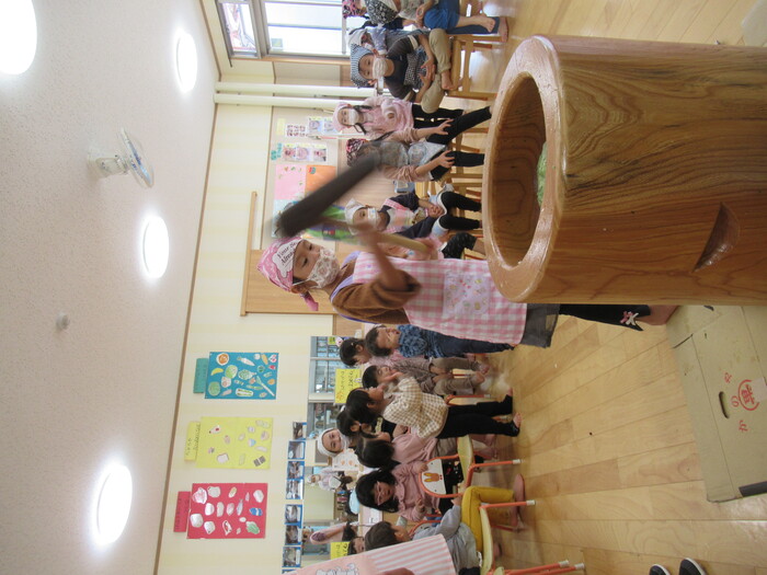 冬に食べたいものと言えば…そう!おもちですよね😊 いるか組、くじら組のお兄さん、お姉さんを中心に力強くおもちをついてくれました!! 待っている間はおもちをつく友だちや先生に対する応援も頑張ってくれましたよ♪ かっこよくついている様子をお見せいたします☆ | ||