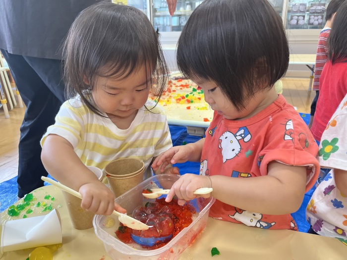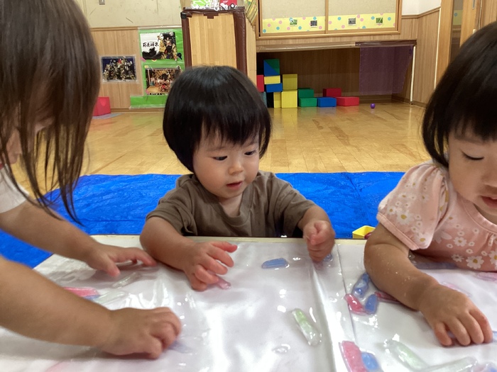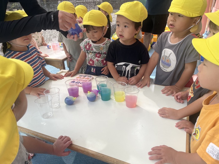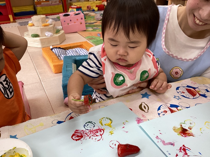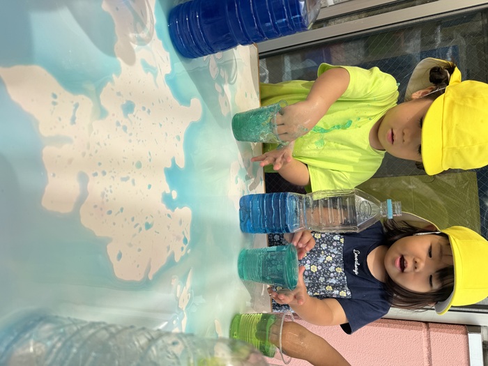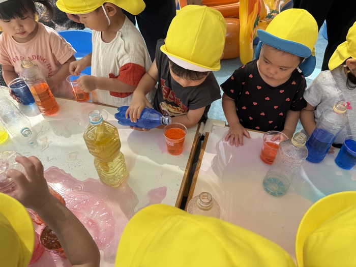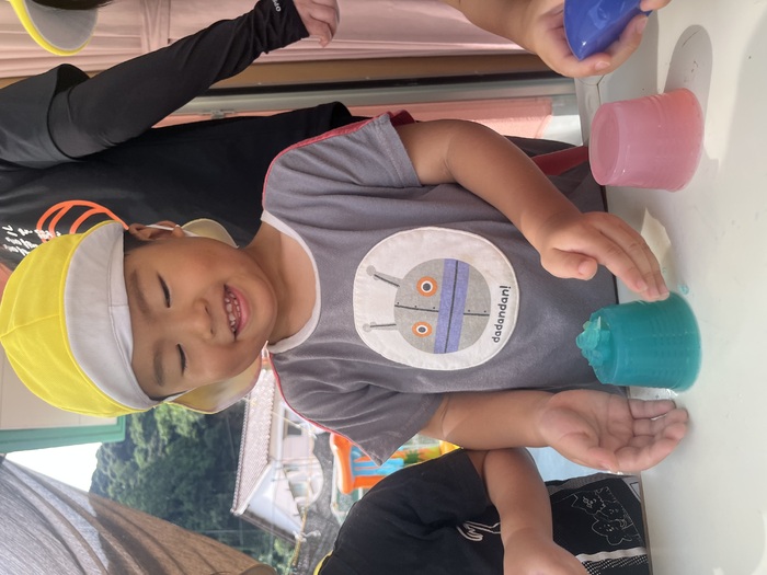 らっこ組 こんがりとやけた子どもたちの顔にこのひと夏の成長を感じているこの頃。 毎日全力で遊んでいるらっこ組さんですよ! 最近は色遊びに興味がある子どもたち! 色を混ぜて色の変化する様子や新しい色ができることを発見するなど 楽しみながらいろいろな色に親しんでいます🌈 | ||
