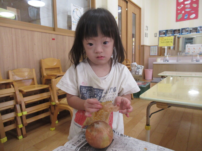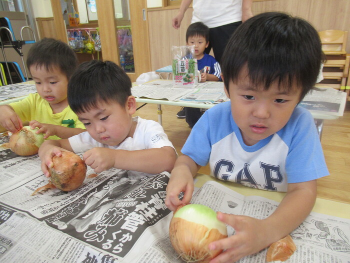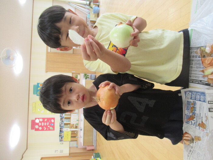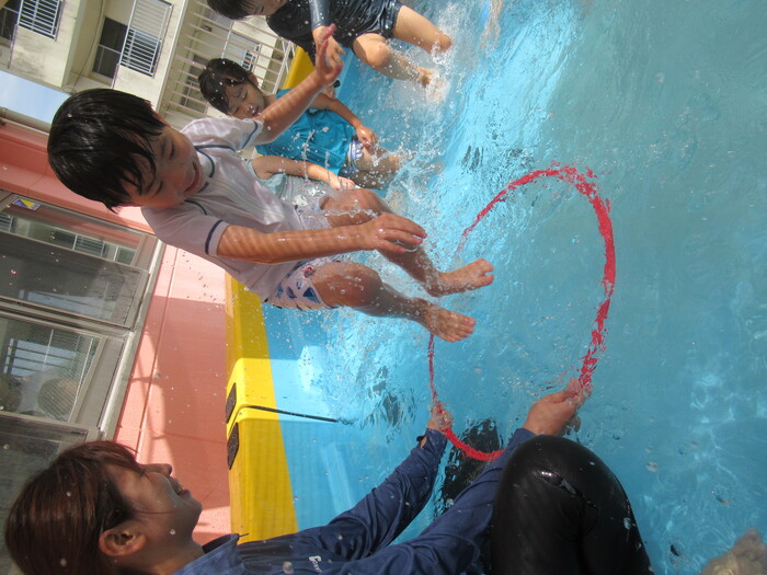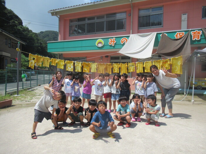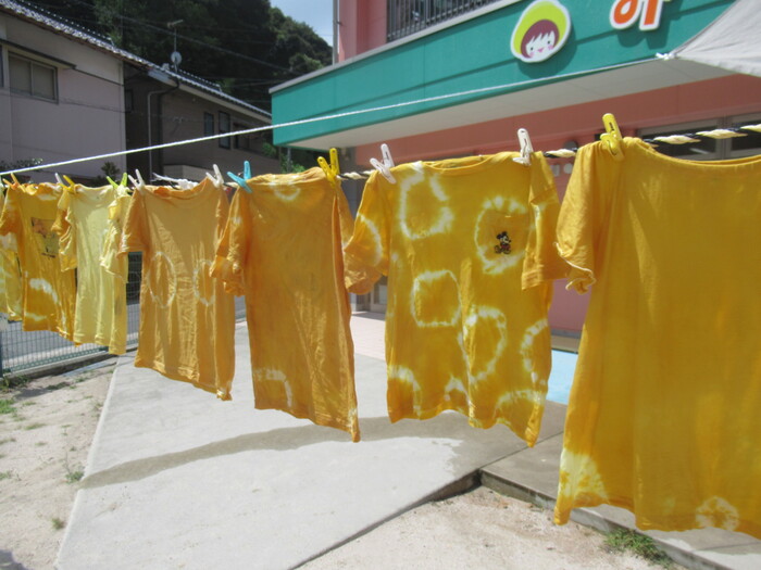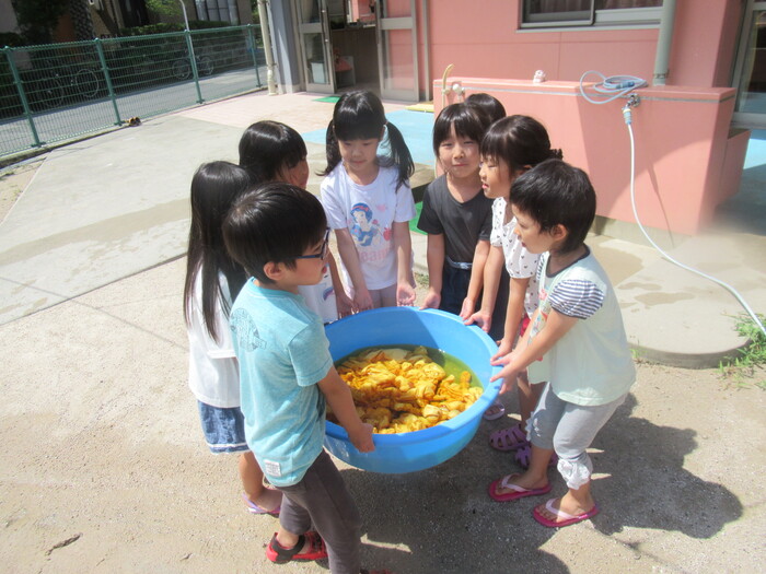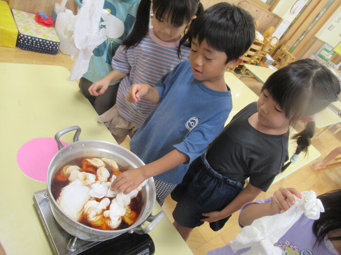 いるか・くじら組 今年はまだまだ暑さが続く中、プールあそびをラストスパート!! だんだんとダイナミックになり、気持ちよさを全身で感じながら楽しんでいました。 年長さんは、玉ねぎの皮を使ってのTシャツ染めに挑戦☆ どんな色や模様になるのかドキドキしながら 真剣に取り組んでいる様子を紹介していきます!! | ||