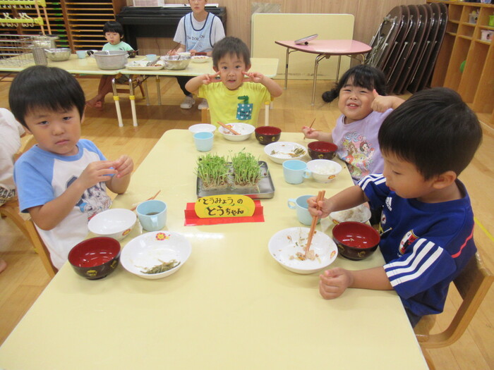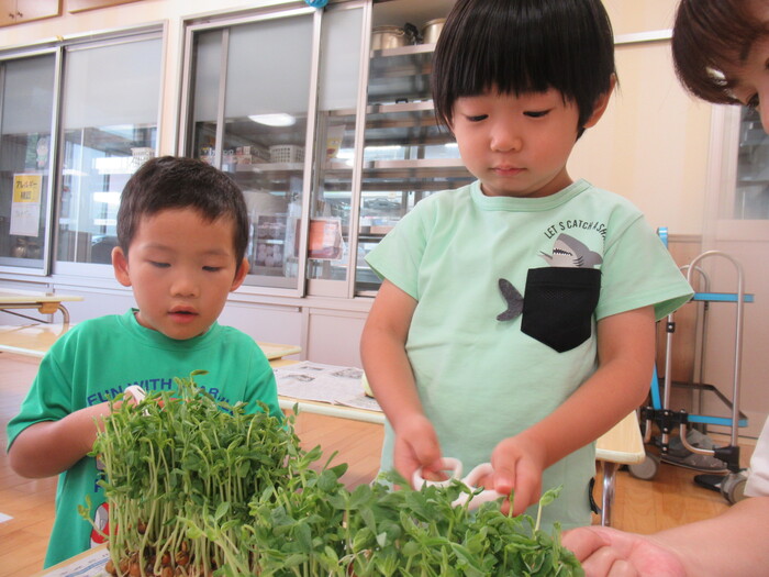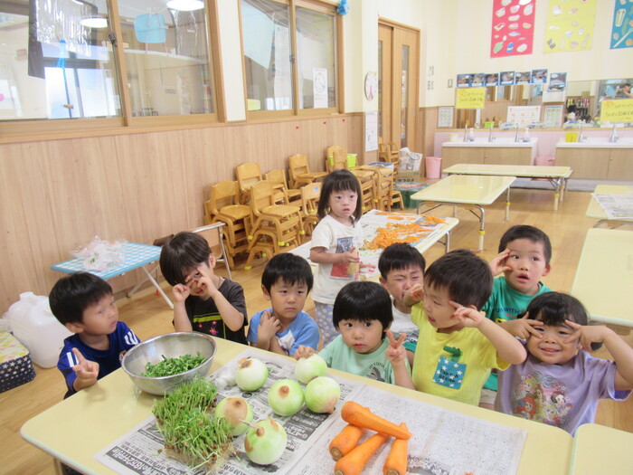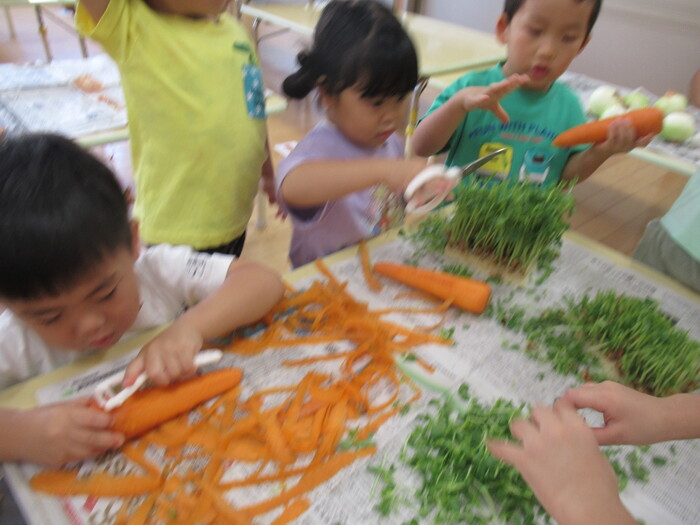 まんぼう組 まんぼう組さんは、給食で食べる食材の皮むきをしました! 給食の先生のお手伝いマンをしよう!と張り切っていました☆彡 出来上がった給食は格段に美味しく食べていました♪ | ||