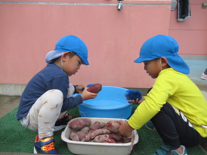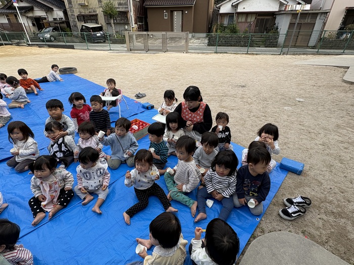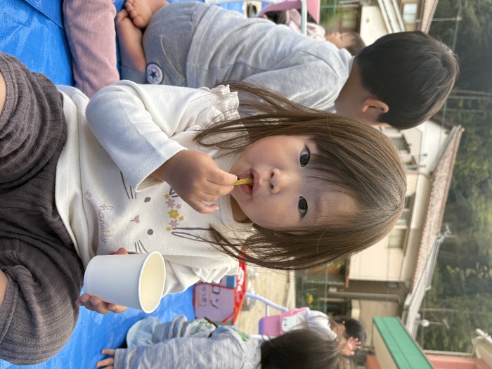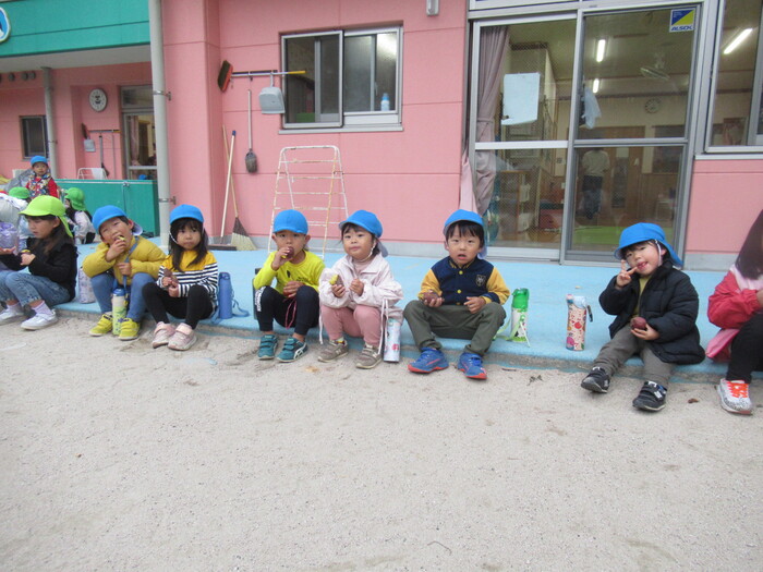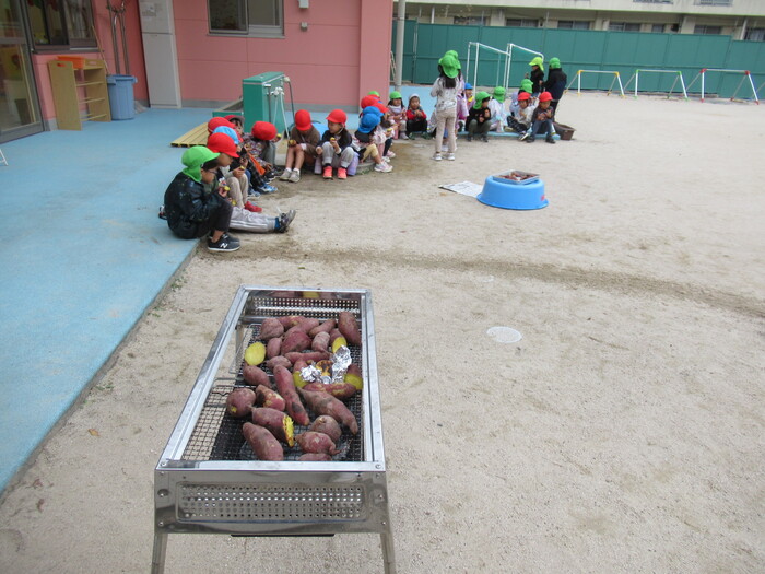まんぼうぐみ 園庭での焼き芋パーティーは、興味津々!!みんなで楽しく食べましたよ♪ | ||