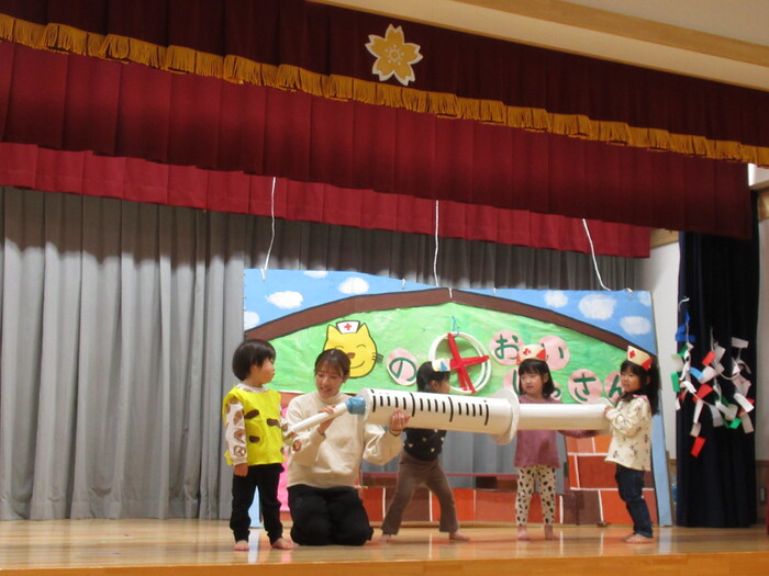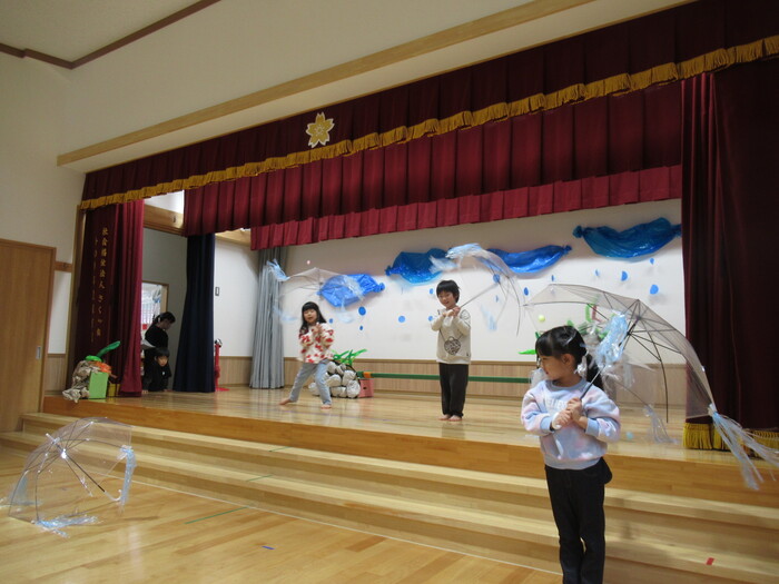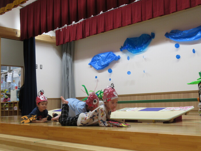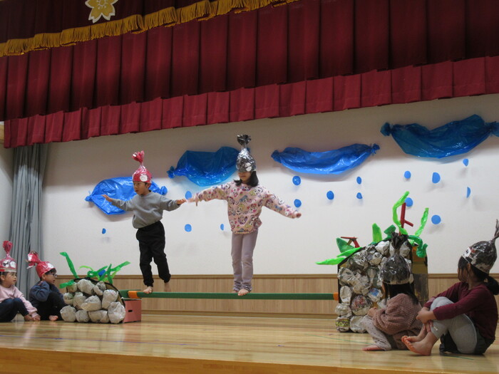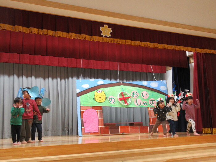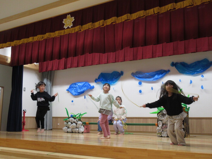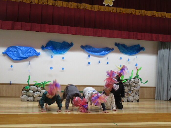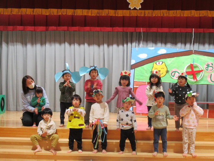 いるか・くじらぐみ ドッキドキの発表会!!インフルエンザが大流行し、次々とお休みしてしまい、全員がそろったのは何と発表会前日…💦それでもコツコツと練習して本番はみんな役になりきって楽しく表現してくれました♡ | ||