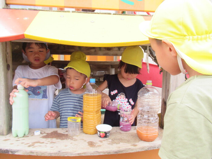 暑い暑い真夏でも、子どもたちは元気いっぱい! あまりの猛暑になかなか外遊びもできませんでしたが、すこ~し曇った日にみんなの大好きな色水遊びを楽しみました。誕生日会で見たジュース屋さんになり、お友達とのやり取りを楽しむお友達。いろいろな色水を混ぜて、色の変化の実験をして発見を喜ぶお友達。思い思いに楽しんでいました(≧∇≦)♪ | ||