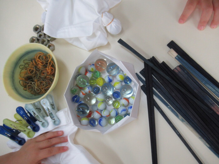出来上がりの模様が分からないため、どうしようか考え悩むみんなでした。 しかし、いろんな材料を1つ...また1つとつけていくと、これもあれもととっても楽しそうでした。 模様をつけたら藍の液に浸して染めます。独特のにおいに鼻をつまむ子もいたり(笑) でもみんな真剣に染めて、洗っていましたよ( •̀ ω •́ )✧ | ||