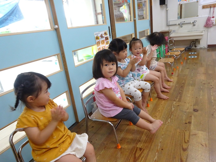 夏と言ったら水遊びですよね!! 朝の会の時「今日は外に出る?水遊びする?」と毎日聞いてくるぱんだ組さんです(⌒∇⌒) お友だちと言葉を交わしながら楽しそうに遊んでいます‼ | ||