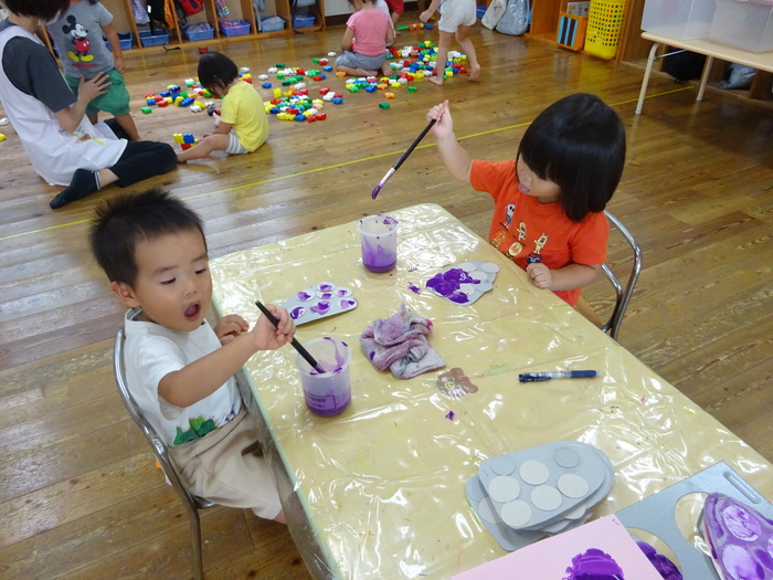 食欲の秋、芸術の秋、到来!? ぱんだ組のお部屋に美味しそうなブドウが、たわわに実りました! 初めて紙版画?に挑戦!厚紙にのりで、くるくるぺたぺた。 最後は筆をもって、ぬりぬり。それぞれの可愛いブドウができました。 | ||
