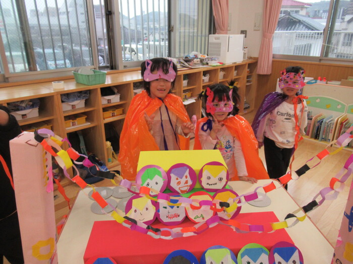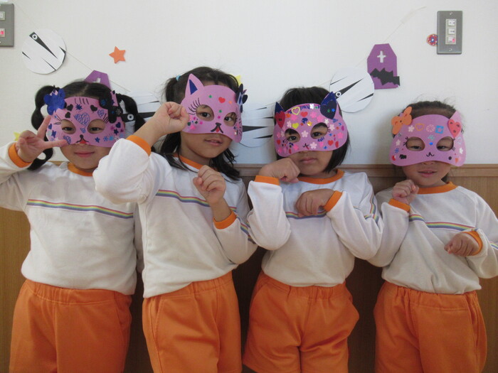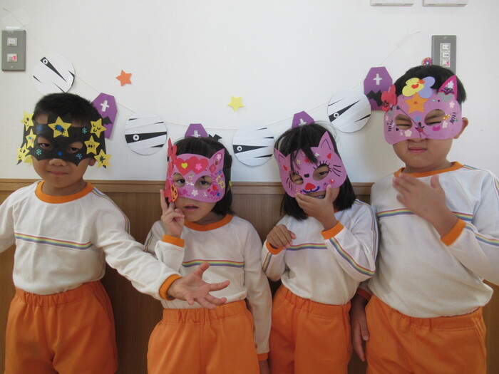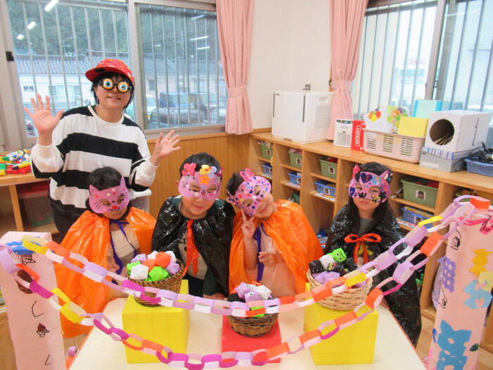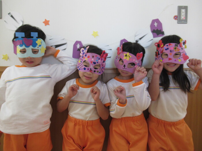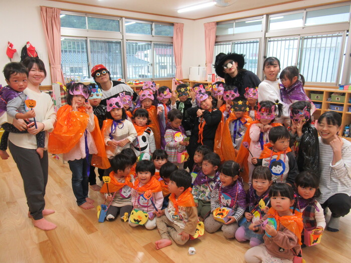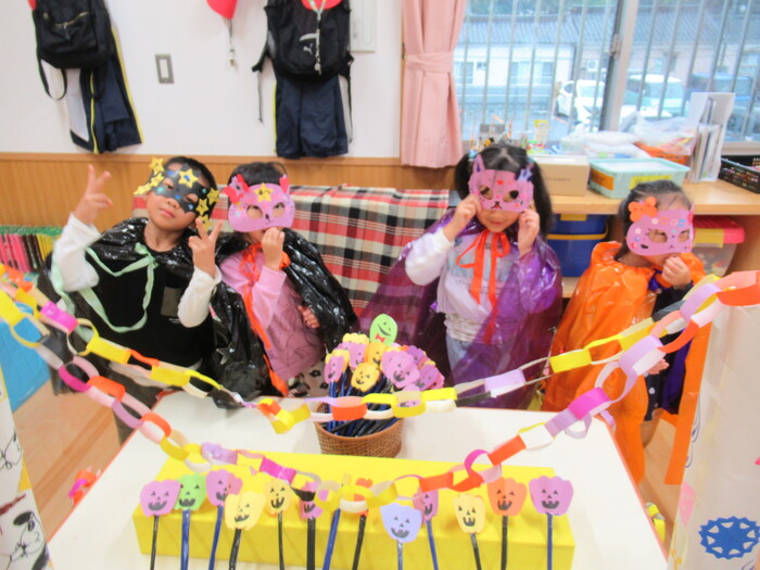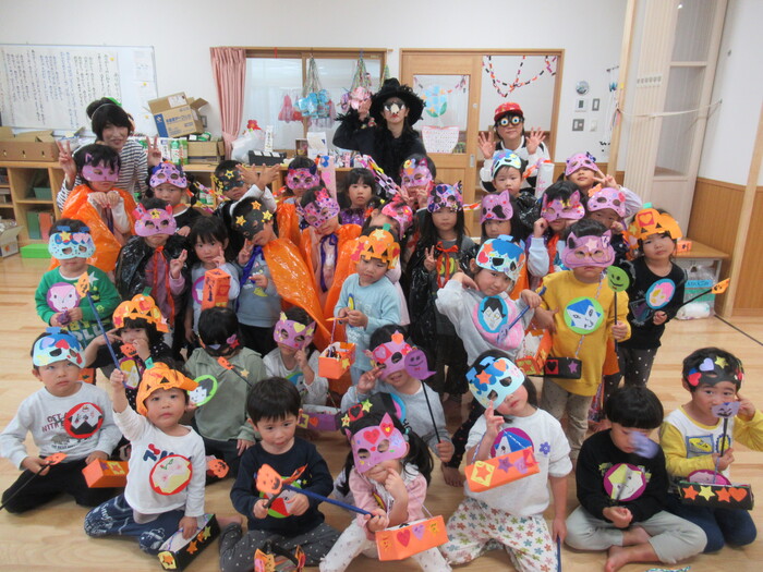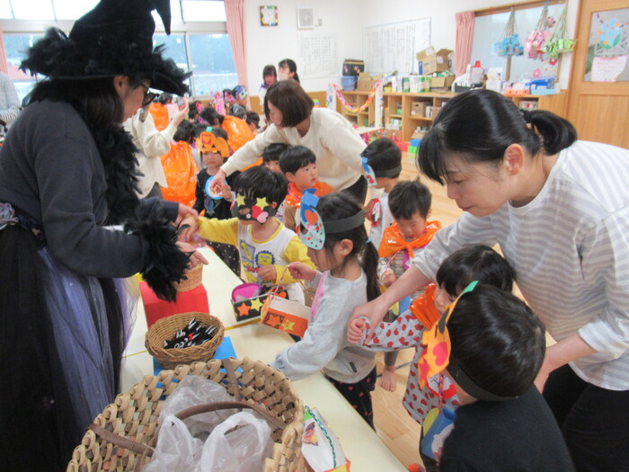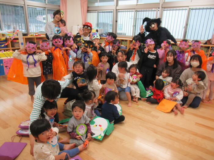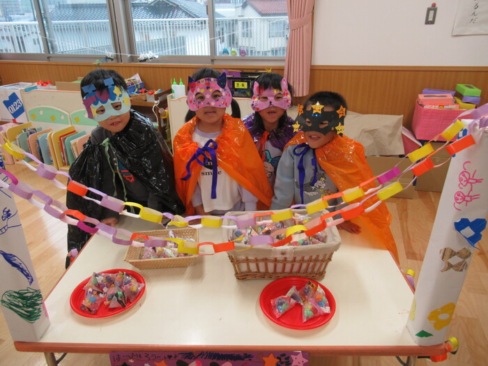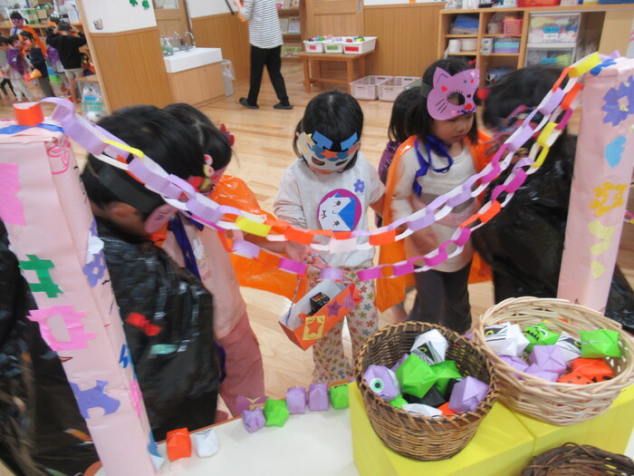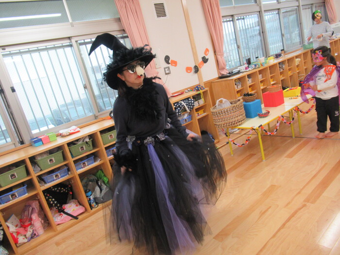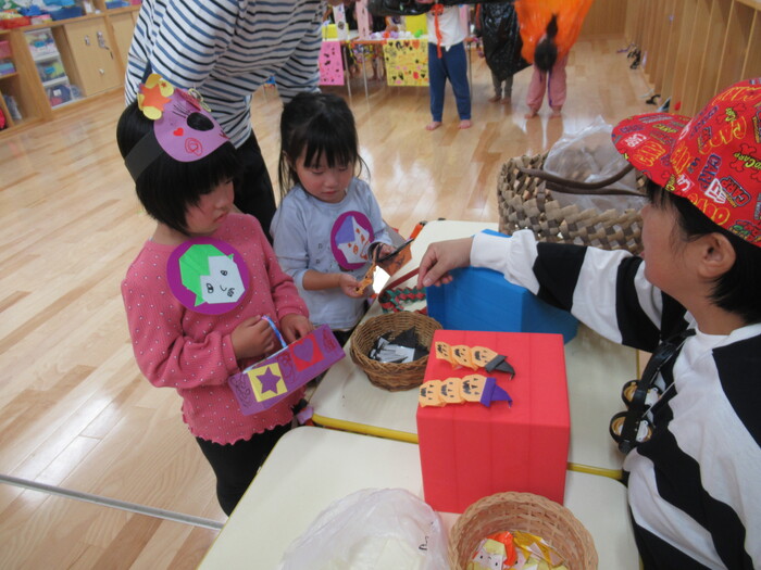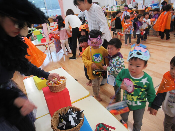 10月31日のハロウィンパーティーの様子(*^-^*) 毎年楽しみにしているハロウィンパーティー☆今年は本物の?!の魔女さんも登場し、オリジナルバックを片手に年長さんのお店屋さんにお買い物を楽しみました♪全クラスで楽しむ様子をみてみましょう(^^) | ||