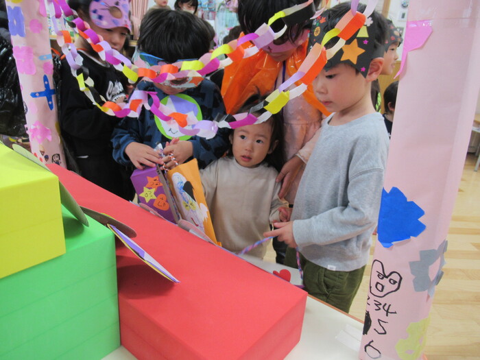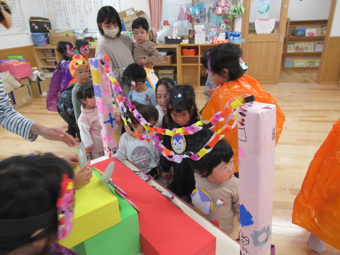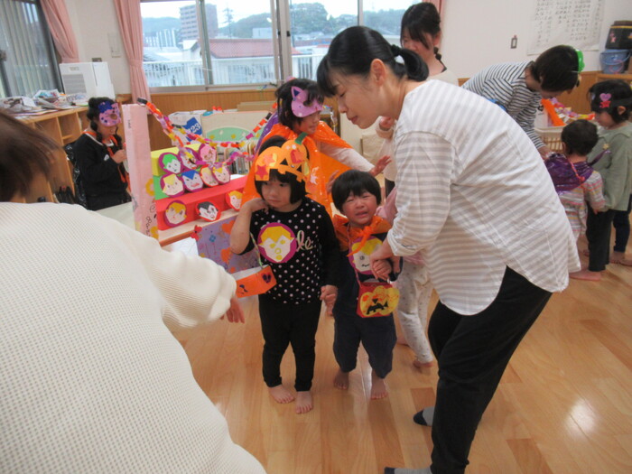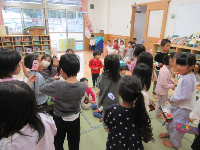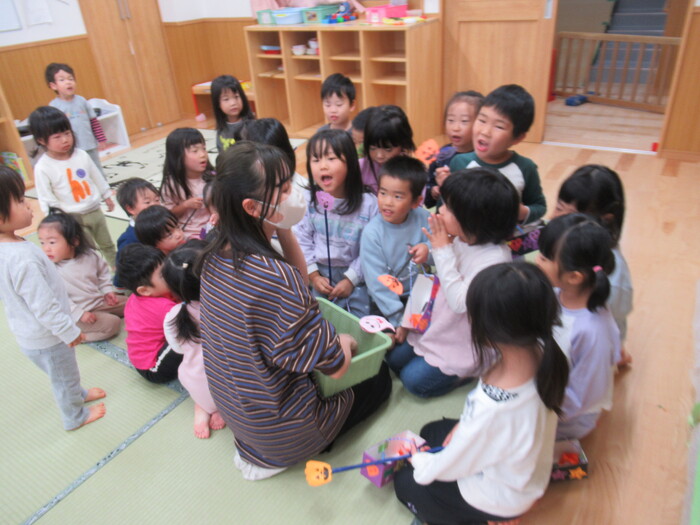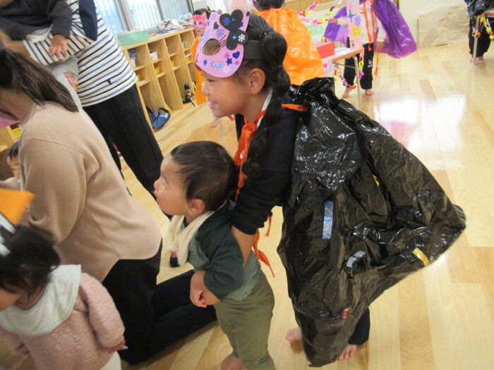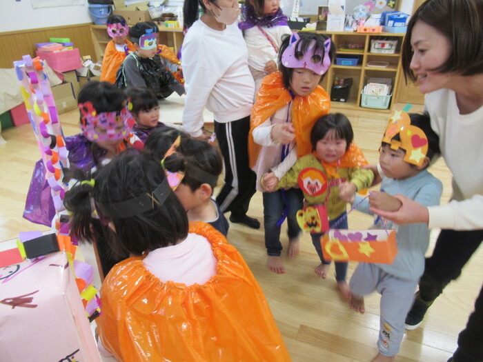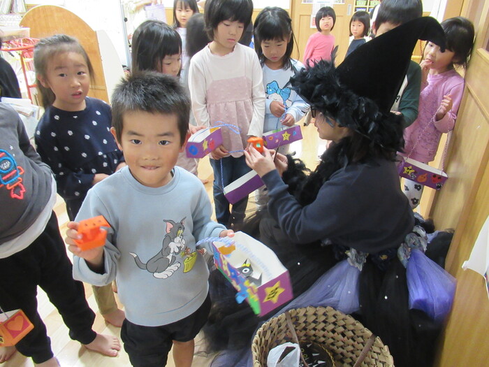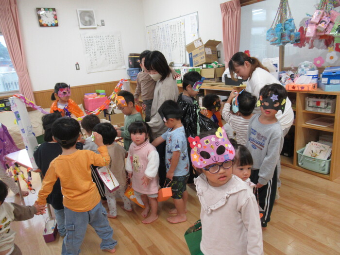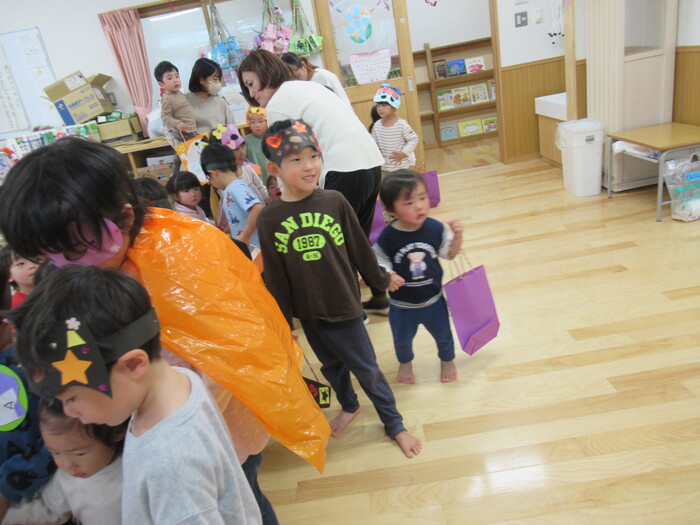 お昼寝起きは、年長さんが各クラスを回って、 ハロウィンのプレゼントをもらいにレッツゴー!!! | ||