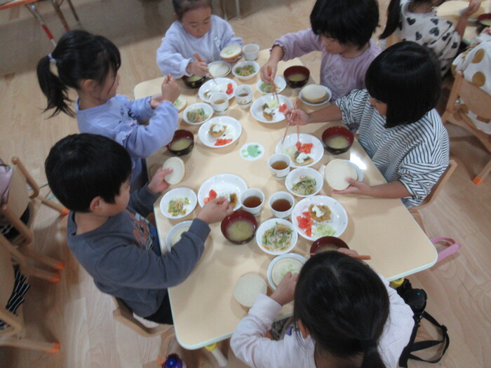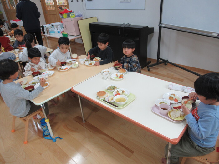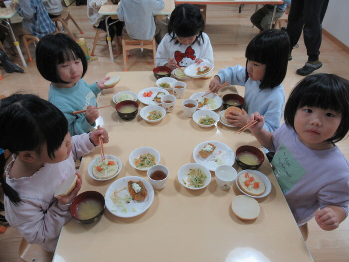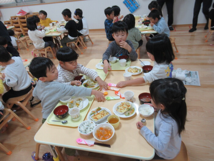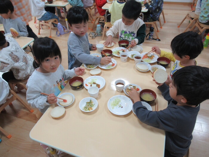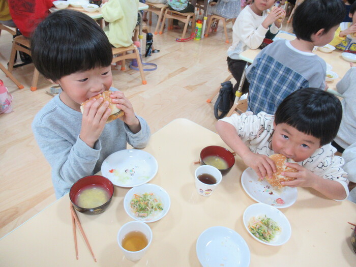 みんな大きなお口をあけて、かぶりついて完食していました(*^-^*) 毎日楽しみにしている給食♪ みんなの元気な源は給食ですねきっと☆食欲の秋です! これからもたくさん食べて風邪に負けないよう元気に過ごしていきたいと思います! | ||