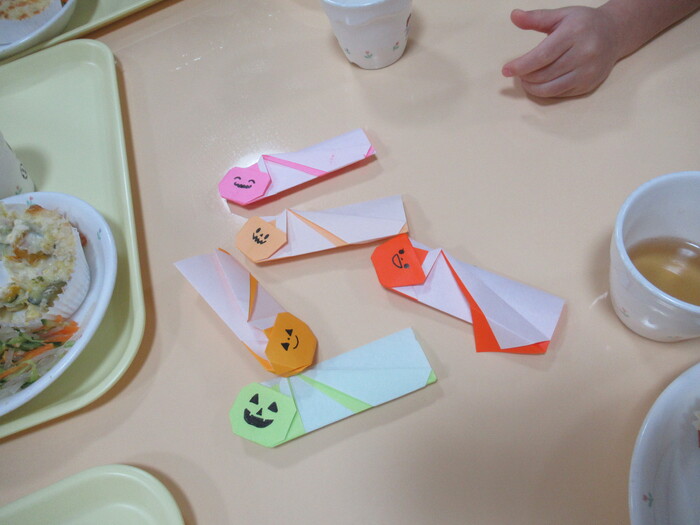 ハロウィンのメニューはカボチャのグラタンなどなど☆給食の先生方が折り紙でハロウィンのスプーン箸入れを折って出してくれました(*^-^*)カラフルな折り紙に子どもたちもウキウキ♪ | ||