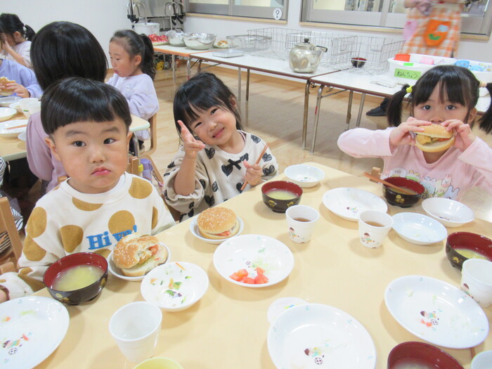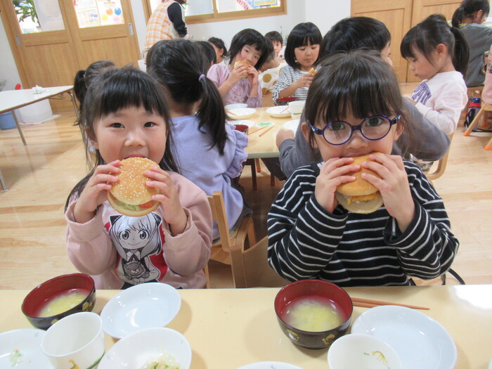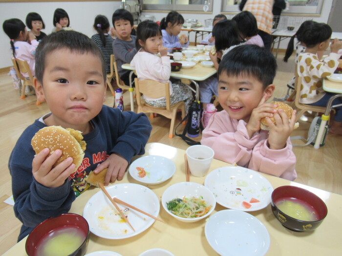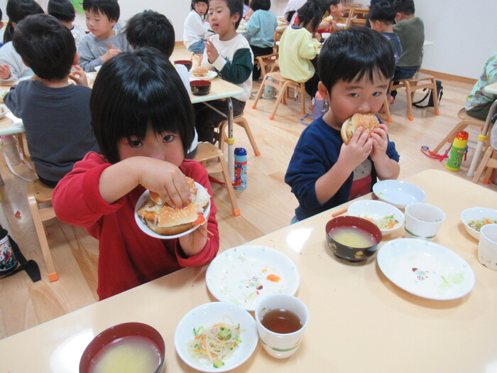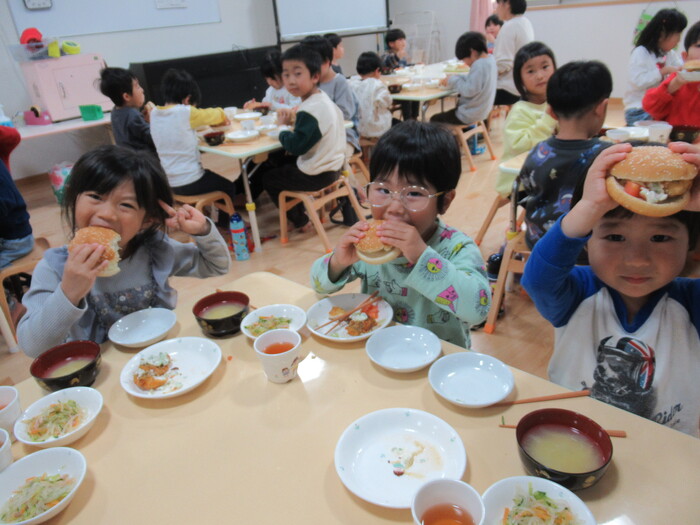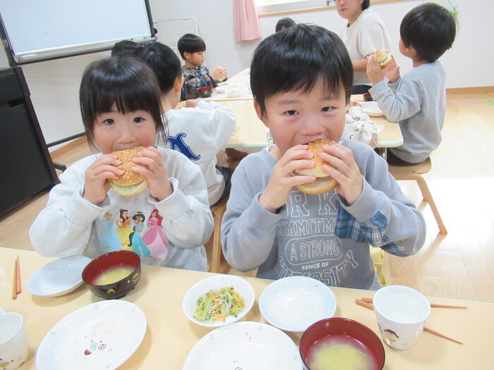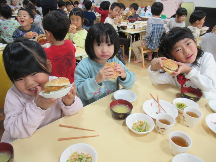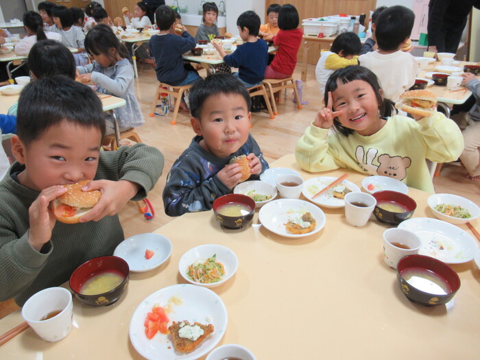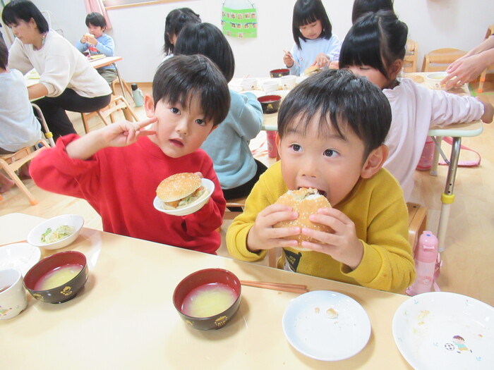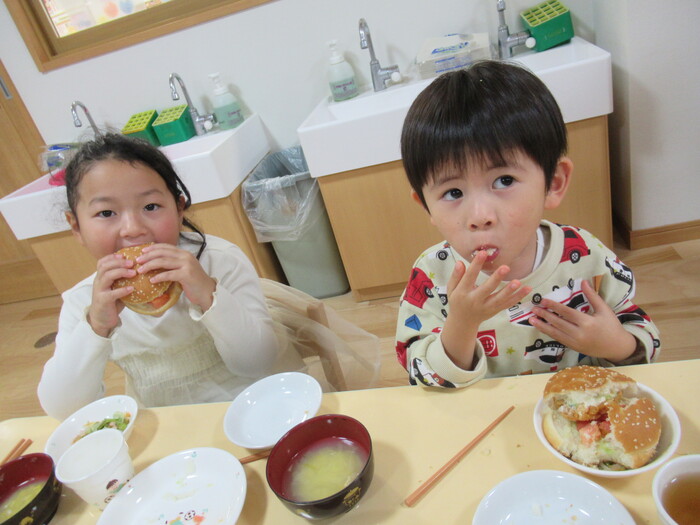 11月のお誕生日会のメニューは「フィッシュバーガー」!!! バンズに具(トマト、キャベツ、バトウのフライタルタルソース)をはさんで食べました!(^^)! 自分でハンバーガーを作る様子や食べてる姿を見てみましょう♪ | ||