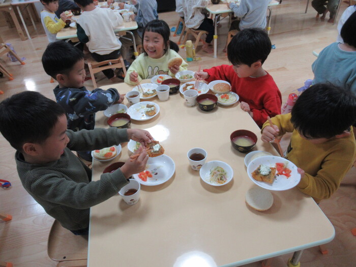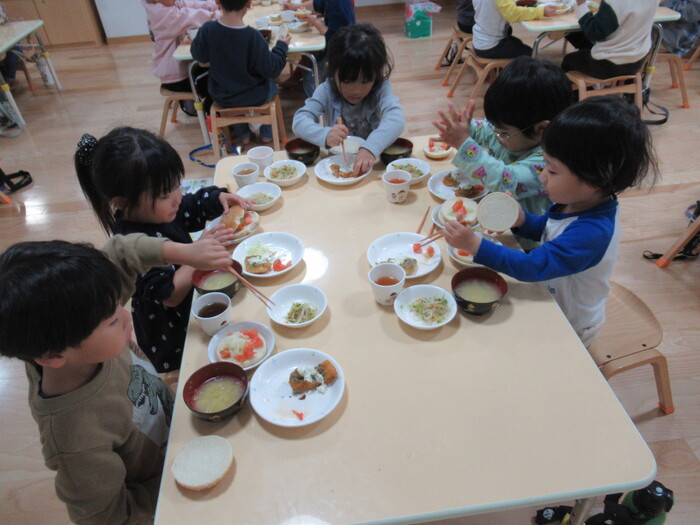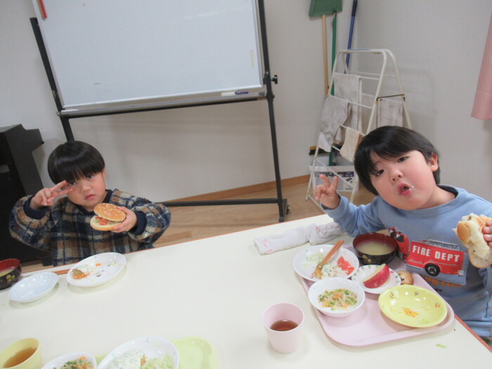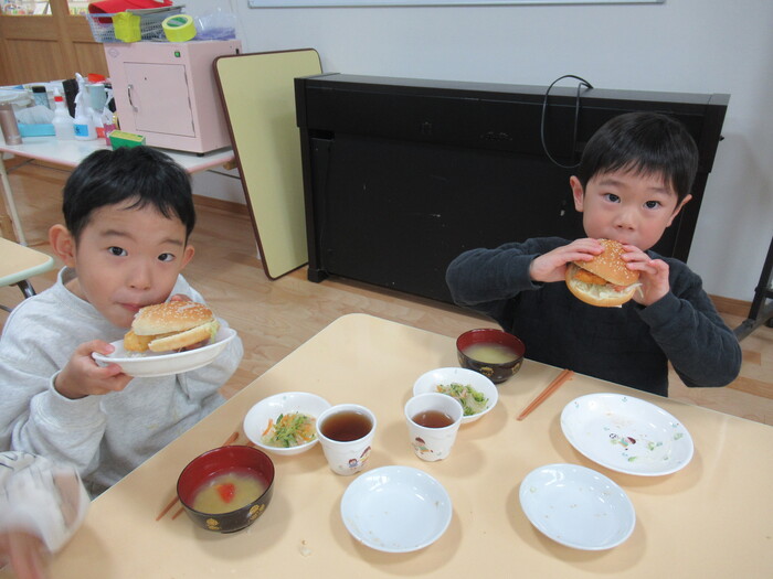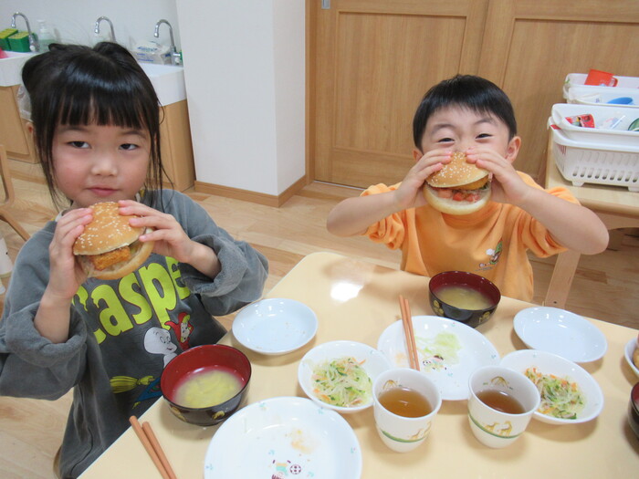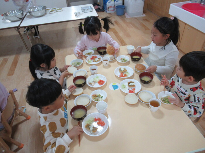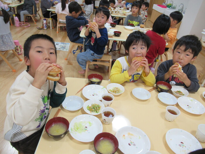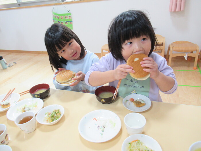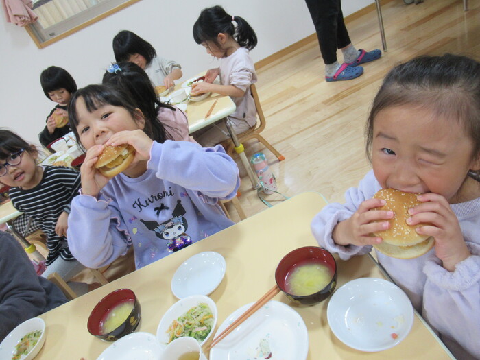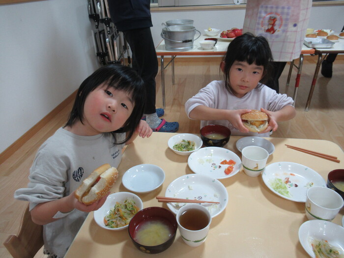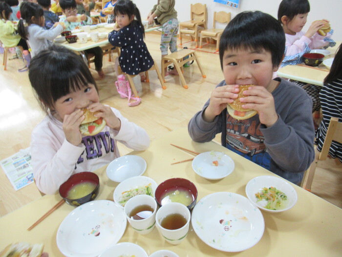 11月のお誕生日会のメニューは「フィッシュバーガー」!!! バンズに具(トマト、キャベツ、バトウのフライタルタルソース)をはさんで食べました!(^^)! 自分でハンバーガーを作る様子や食べてる姿を見てみましょう♪ | ||