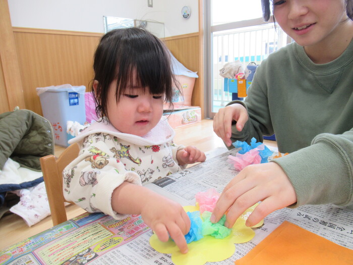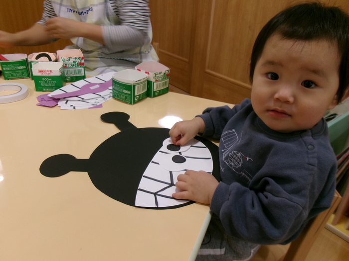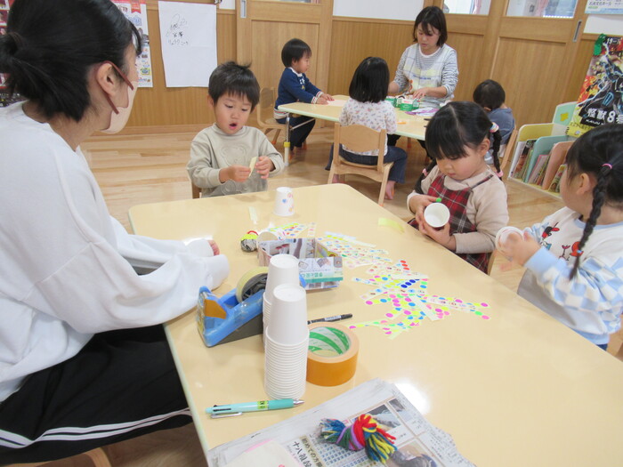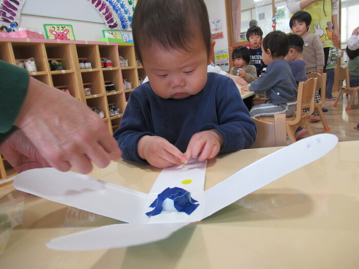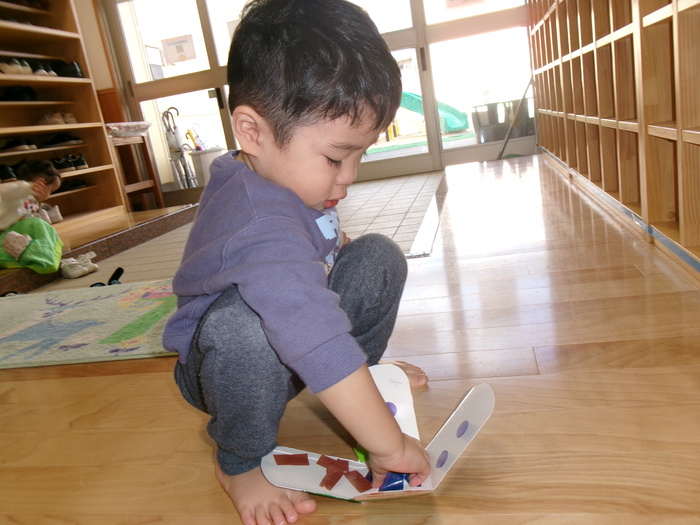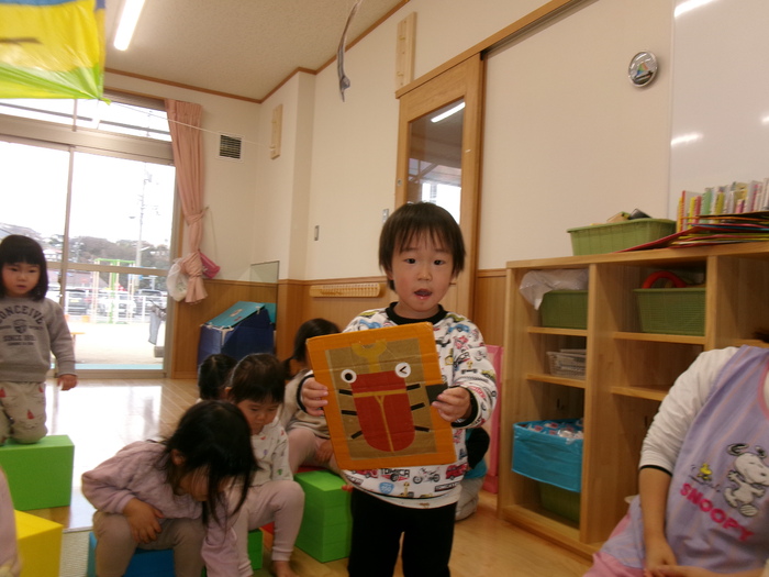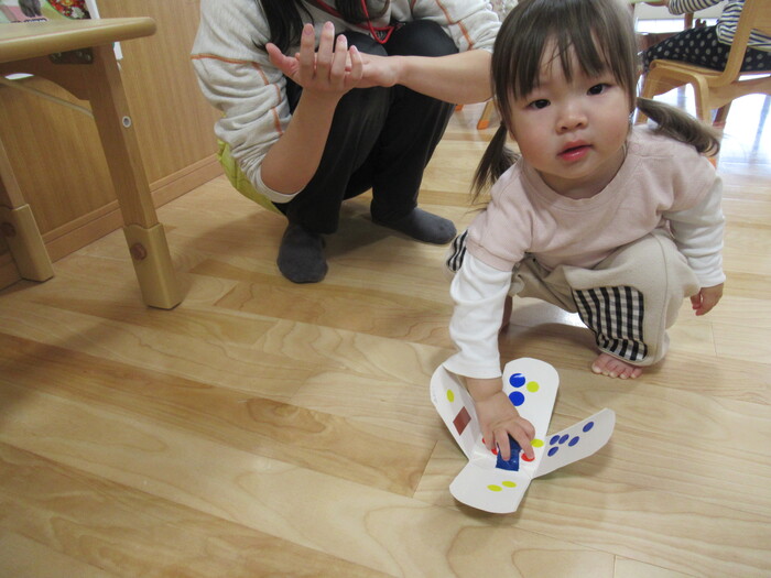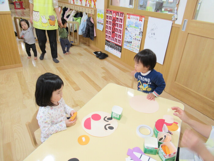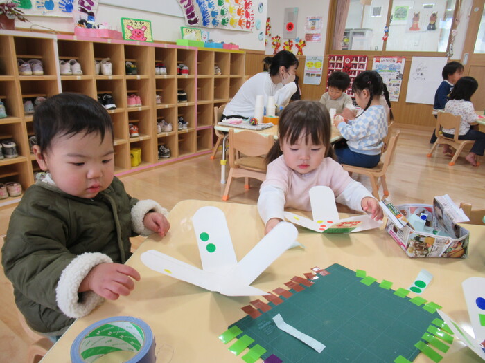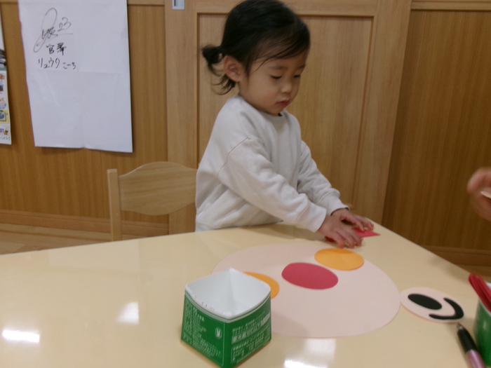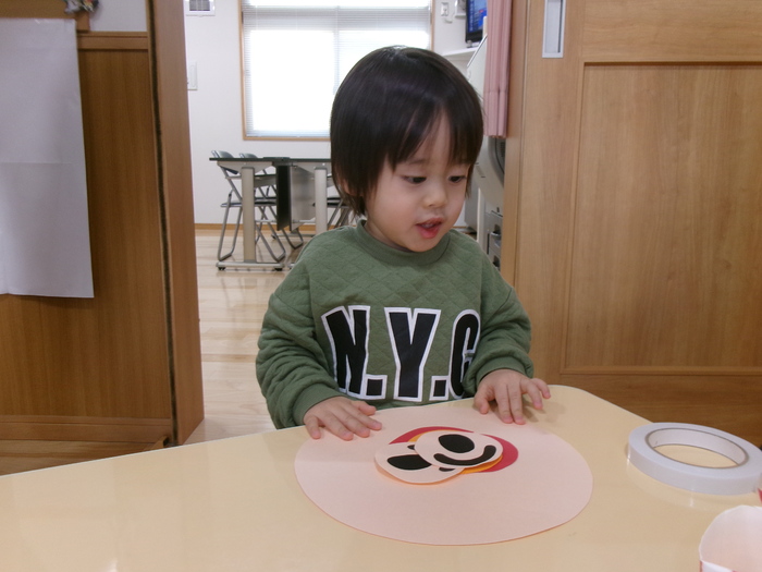 ひよこ、うさぎ、ぱんださんでお正月遊びの製作をしました。 福笑い、けん玉、こまなどです。 楽しい作品が沢山できましたよ! みんなも興味津々のようで、楽しんでおられました! | ||