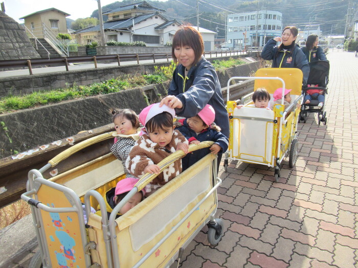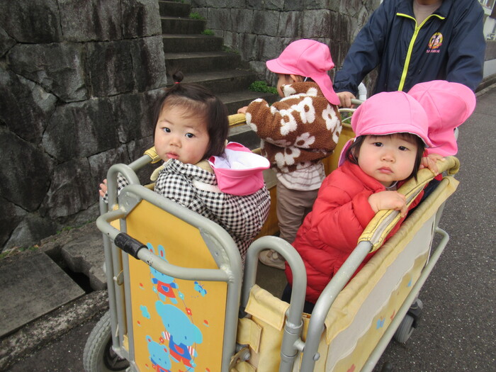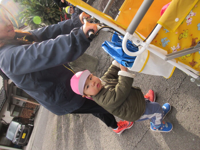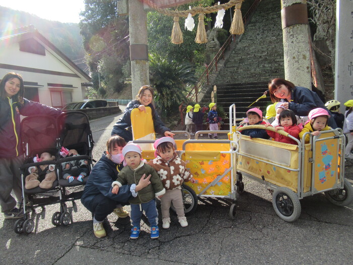 お日様が久しぶりに出てきたので、ひよこ組さんで、近くの社家地神社へ、初詣にいきましたよ!! 良い年になるように皆でお願いしてきました! 歩くのがとってもじょうずになりました!ながーい距離も頑張って歩けますよ! | ||