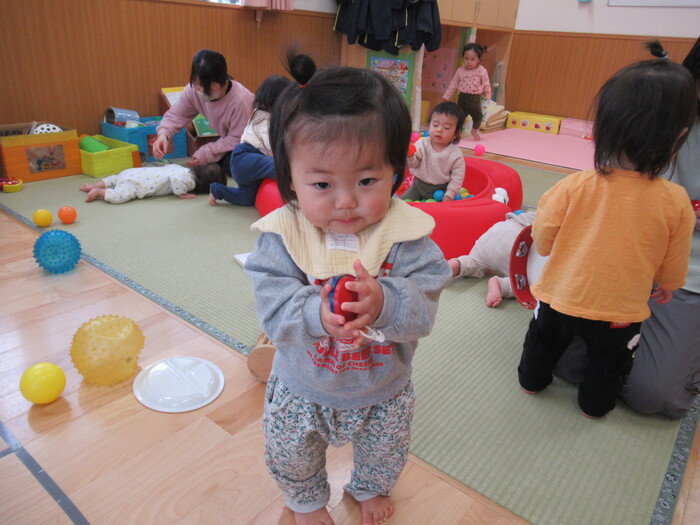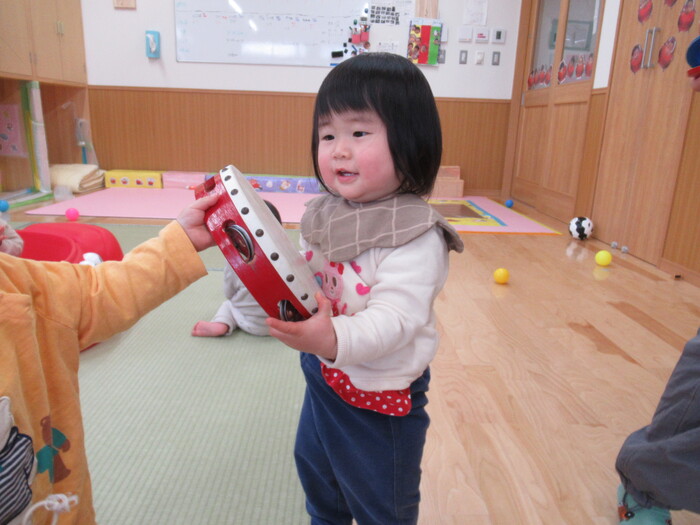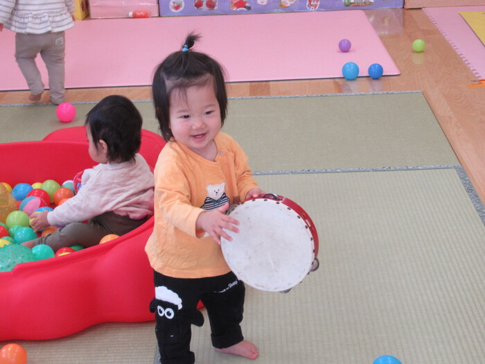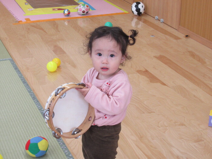 お部屋で、おもちゃのチャチャチャが流れてきたらタンバリンや、カスタネットで、上手にリズムをとるひよこさんです!! かわいい~❤❤ | ||