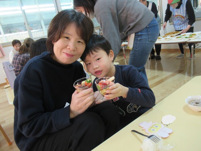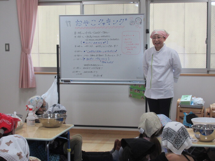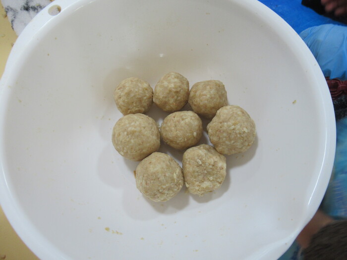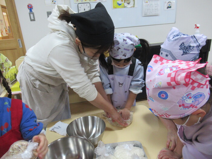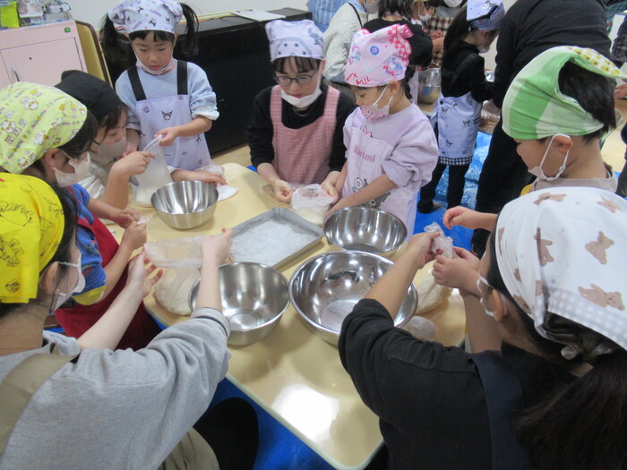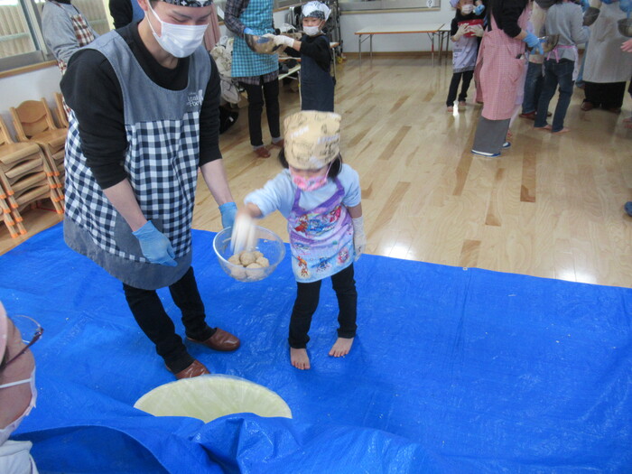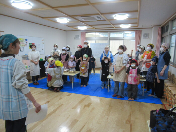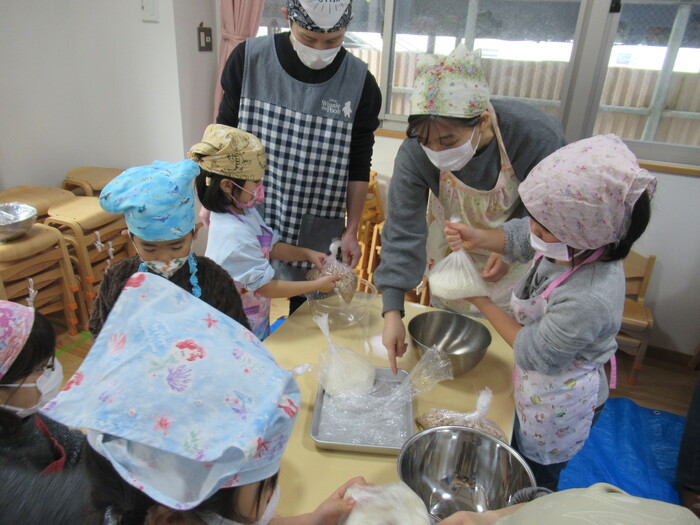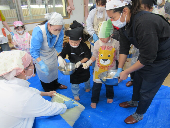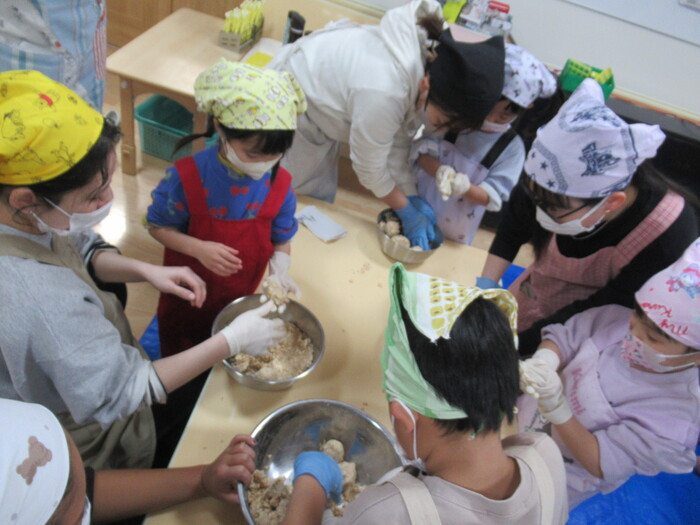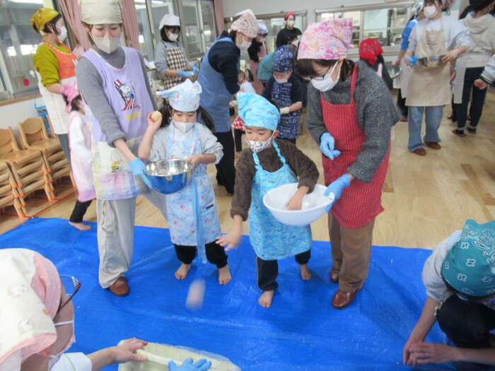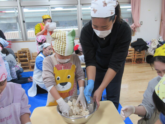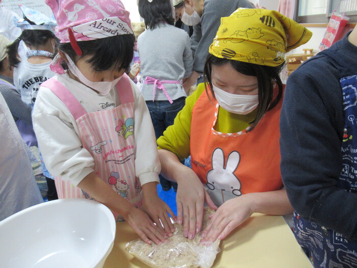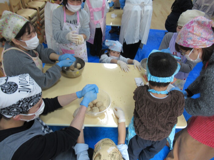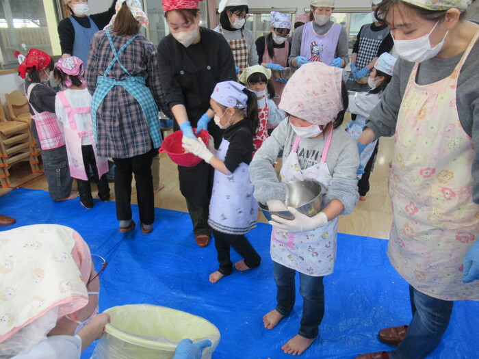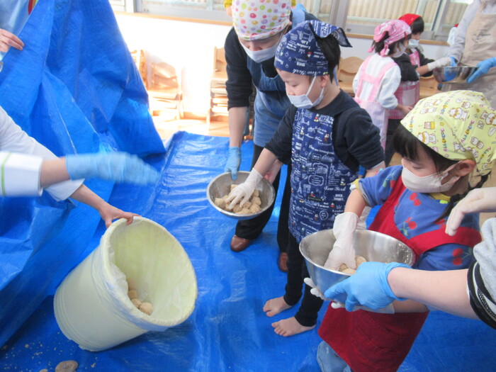 年長さん楽しみにしていた親子クッキング(*^_^*) お父さんやお母さんと一緒に今年は味噌作りに挑戦!!! | ||