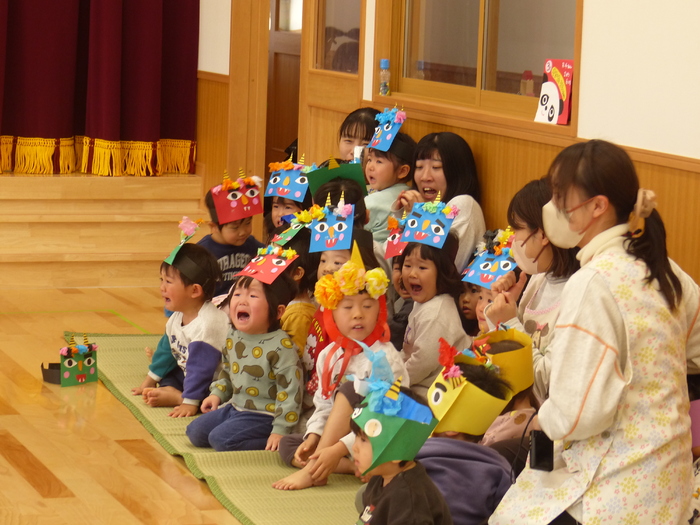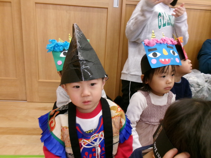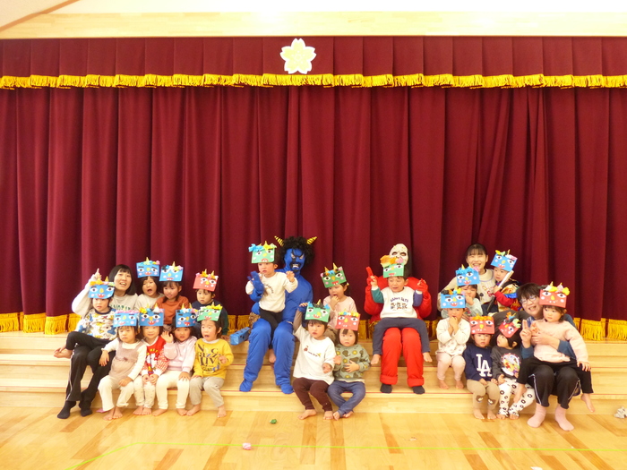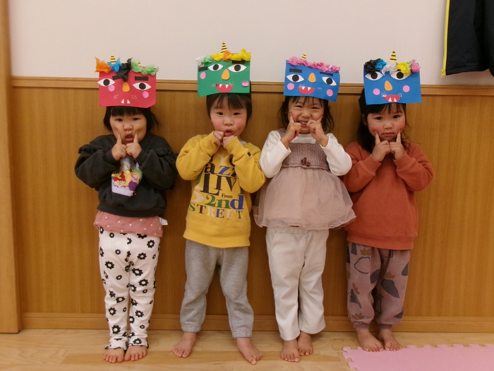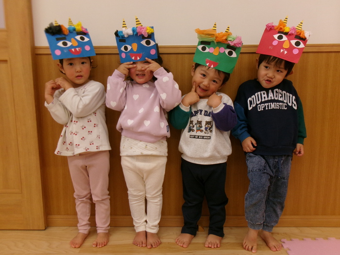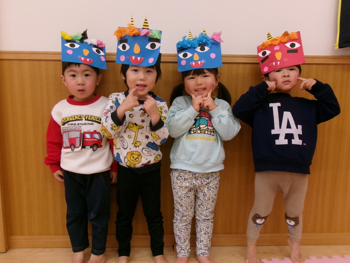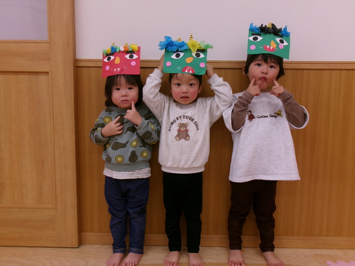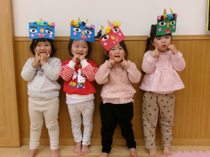 鬼は外~福は内~♬ 自分で作った鬼面をかぶって“ハイ!ポーズ(≧▽≦)” 2月3日には、誕生会・節分会があり鬼面をかぶって参加しました☆彡 ルンルンで参加したのもつかの間…鬼の出現でもうびっくり!!! やさしくなった鬼との記念写真もやっとのことで撮れましたよ! みんなの心の中の鬼はこっそり逃げていったかな~? | ||