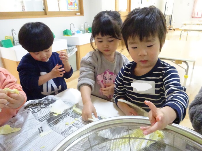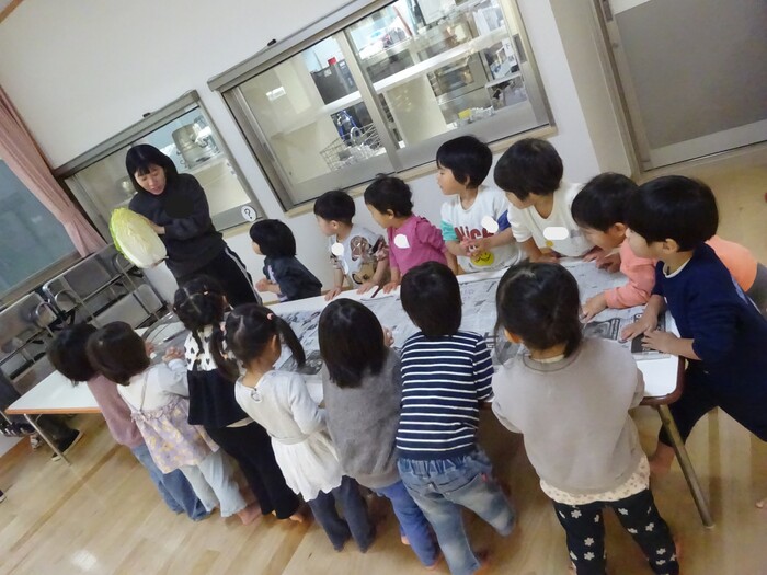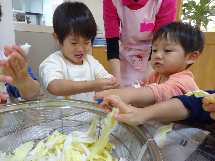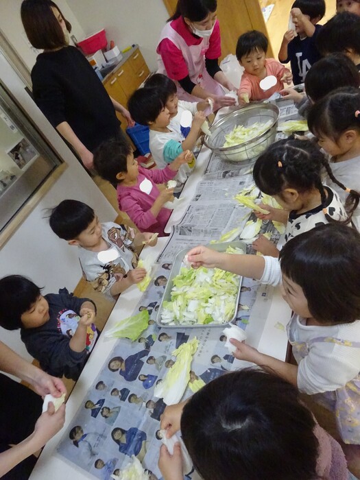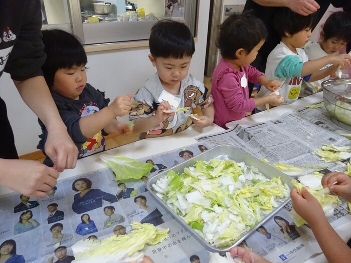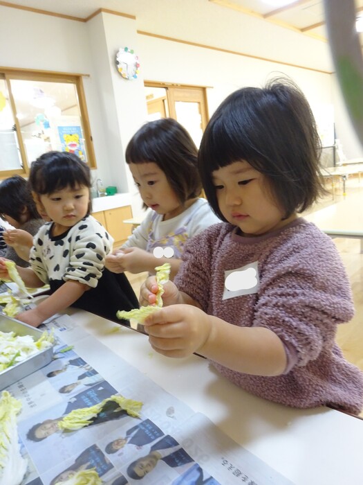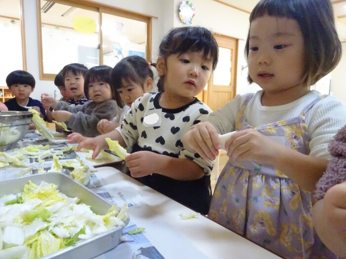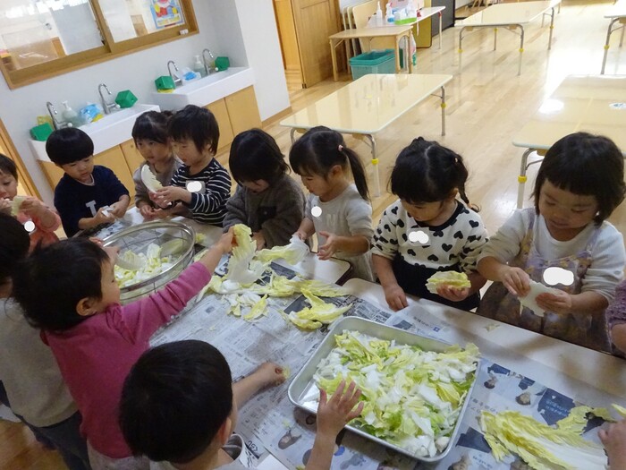 おたすけマン参上~!!! 白菜ちぎりのお手伝いをしました。 白菜を一枚ずつもらってちぎっていく子どもたち☆ “このくらい?”“ここ(芯の部分)むずかしいね” と友だちと話しながら真剣な表情で進めていっていましたよ。 みんなでちぎった白菜は、その日の給食のお汁でおいしくいただきました! また、おたすけマンが出動する日がきますように(*^-^*) | ||