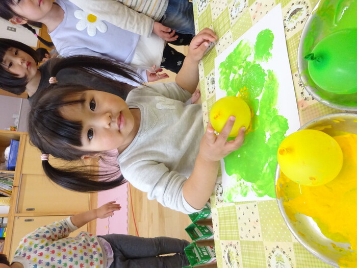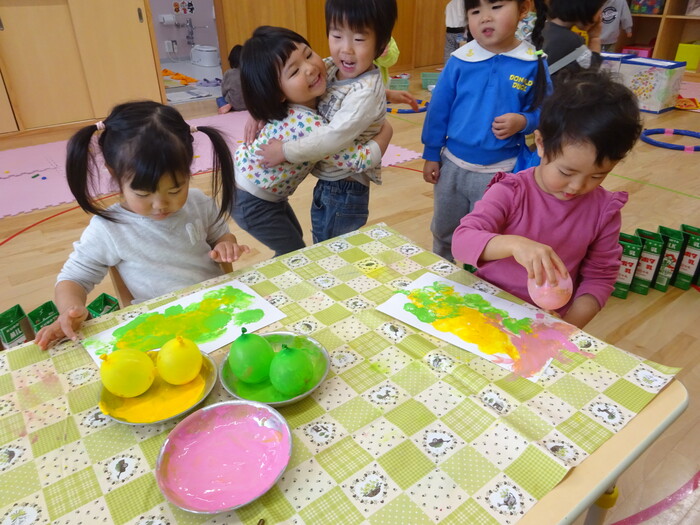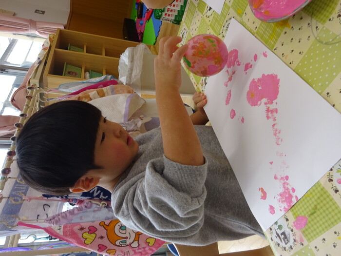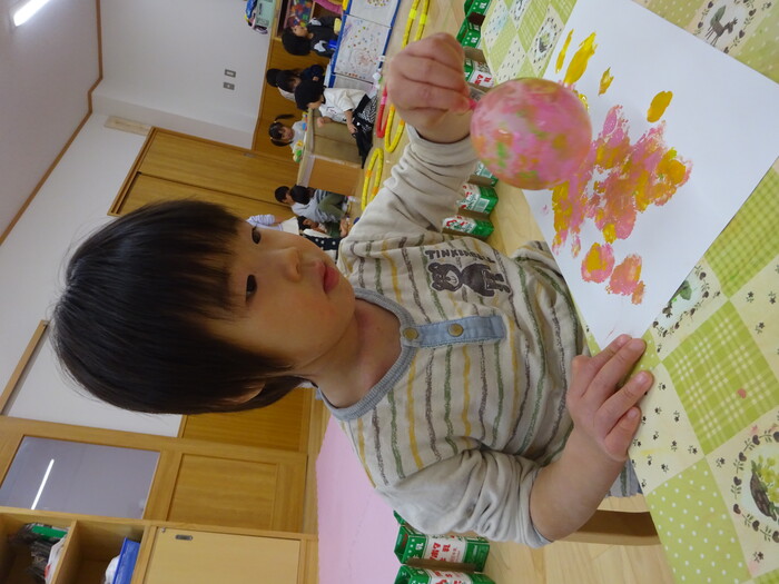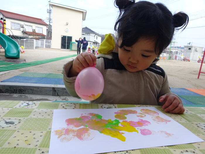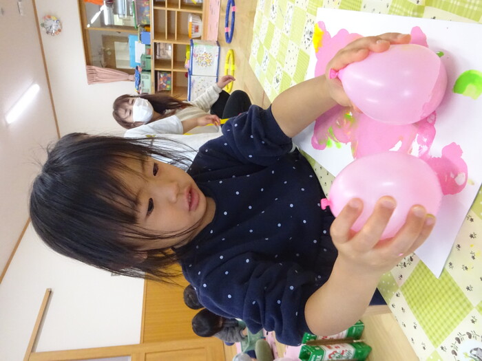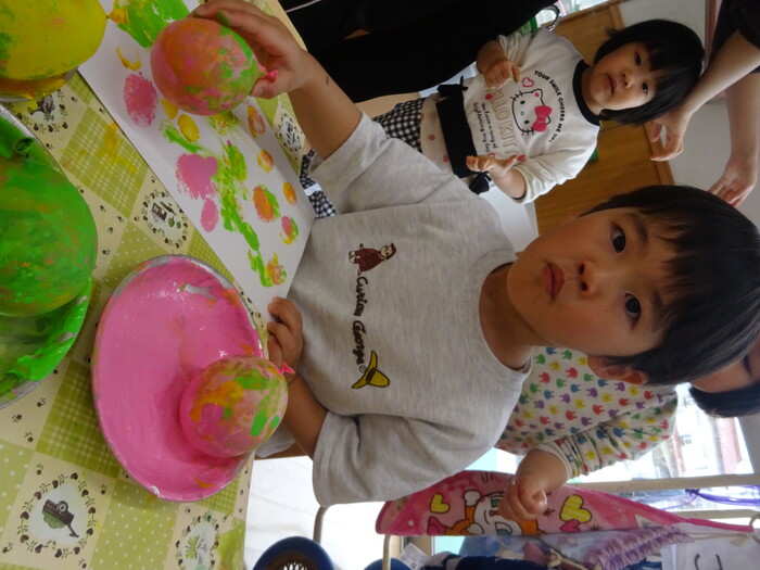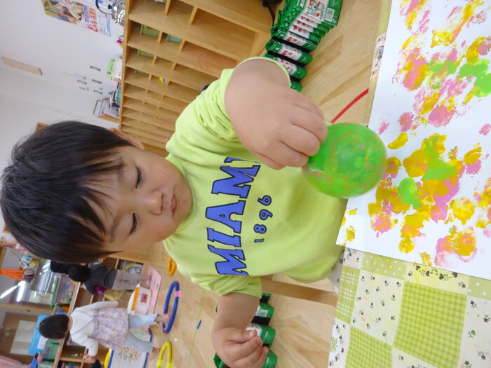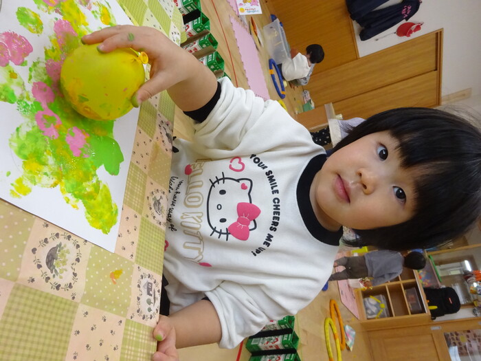 絵の具でポンポン♬ 白い画用紙に絵の具をつけた風船で模様をつけました。 “ピンクがいいな!”“きいろちょうだ~い”と思い思いの色を選んで 模様がつくのを楽しんでいましたよ♡ | ||
