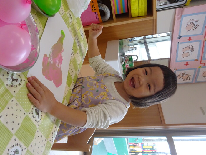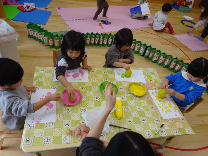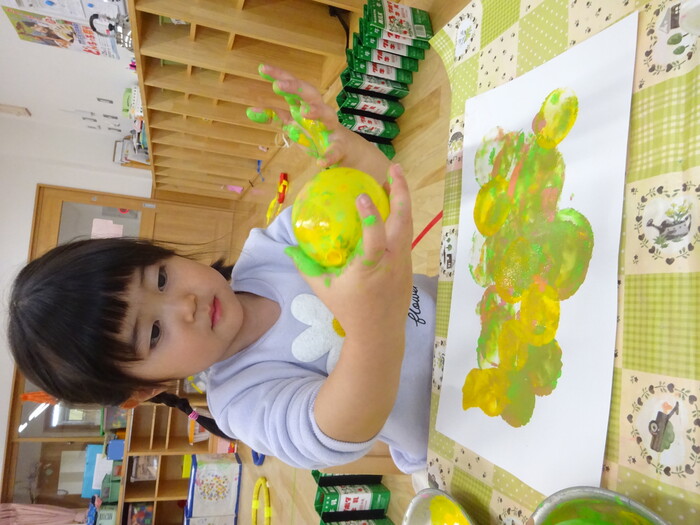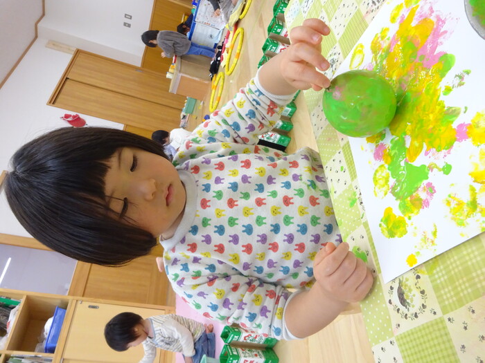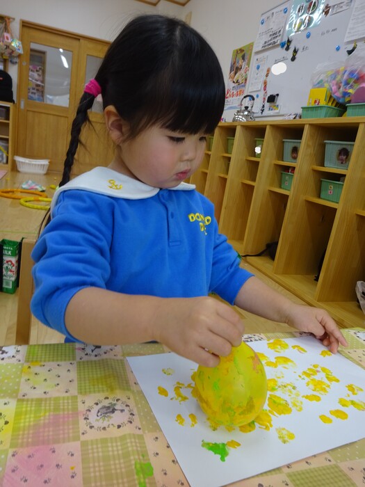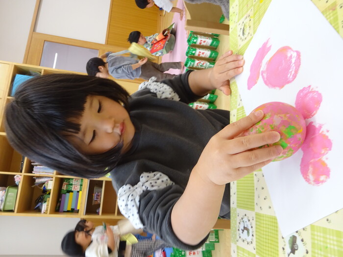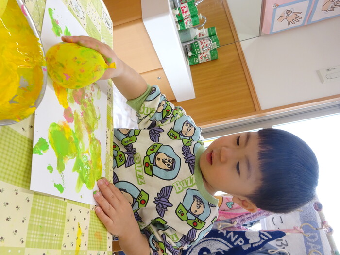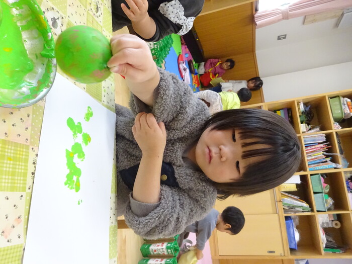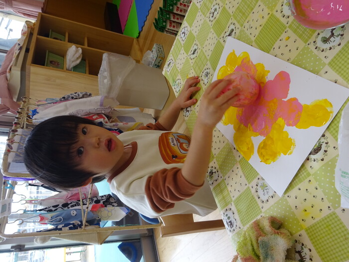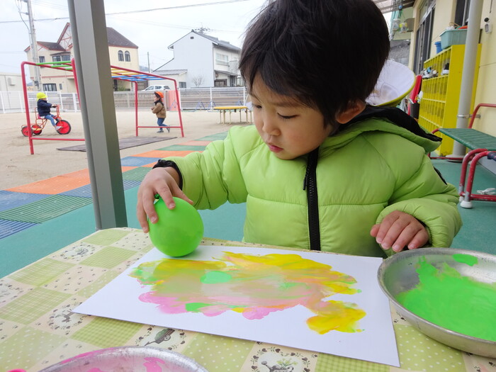 絵の具でポンポン♬ 白い画用紙に絵の具をつけた風船で模様をつけました。 “ピンクがいいな!”“きいろちょうだ~い”と思い思いの色を選んで 模様がつくのを楽しんでいましたよ♡ | ||