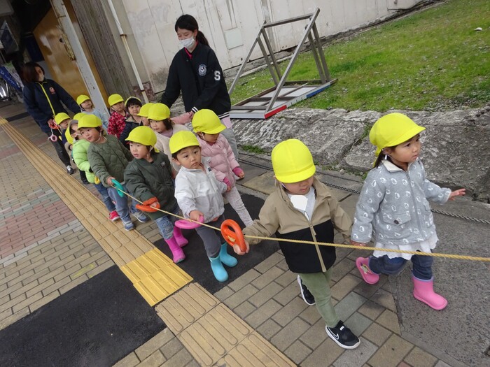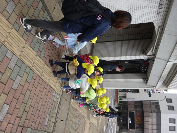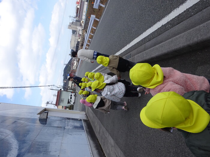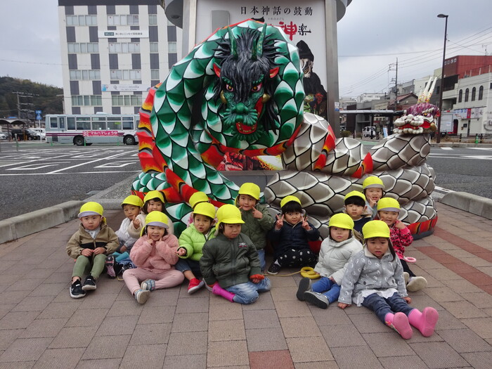 お散歩にレッツゴー☆彡 暖かい日にはみんなで散歩に出かけました。 どんちっち時計では、ちょっぴり怖くて先生に抱きつく子や興味津々で見入る子など 子どもたちの様子は様々でしたよ! 保育園に帰る前、大蛇のオブジェの前で写真を撮りました👹 別の日には、初めて誘導ロープを使わずに友だちと手を繋いで酒ゴリラまで歩きました。 何かに引き寄せられるかのようにふら~っと道の中央へ行こうとするペアや 道路を横断する時には“はい!行きまーす!”の先生の掛け声に みんながだんご状態になって一気に渡ったり… いろんなハプニングにドキドキしながらも 楽しく、そして成長を感じた散歩時間になりました♪ | ||