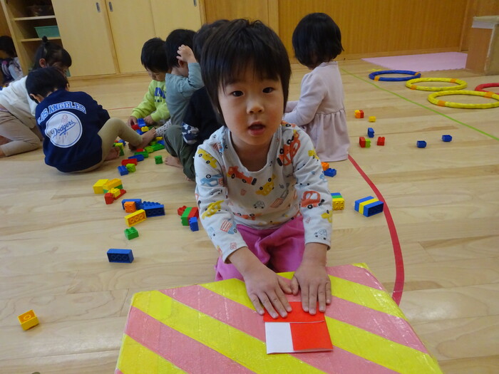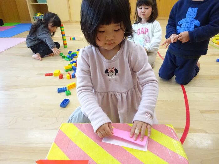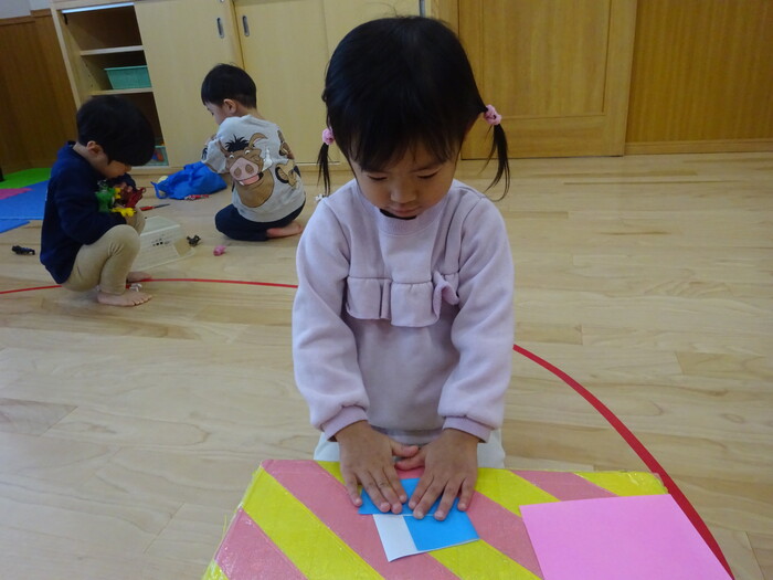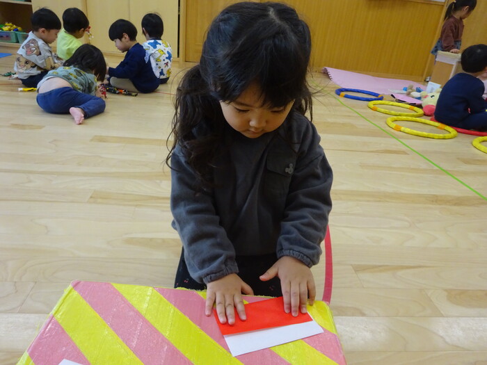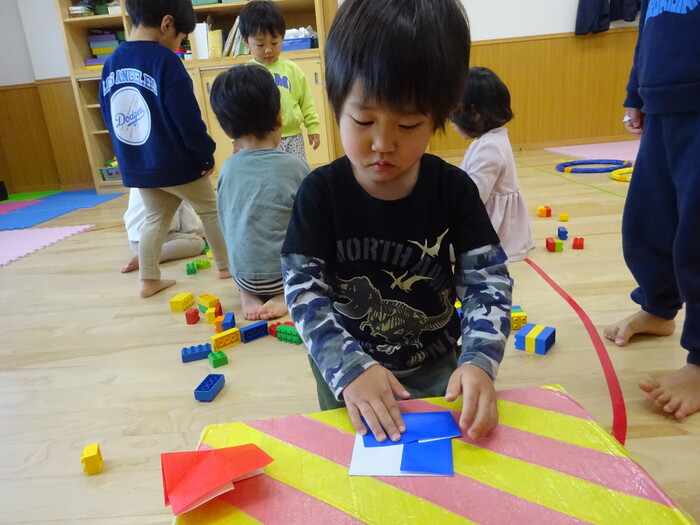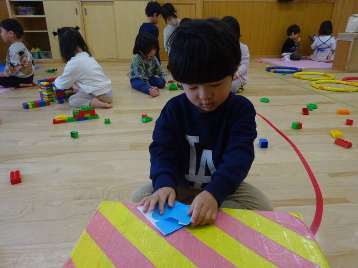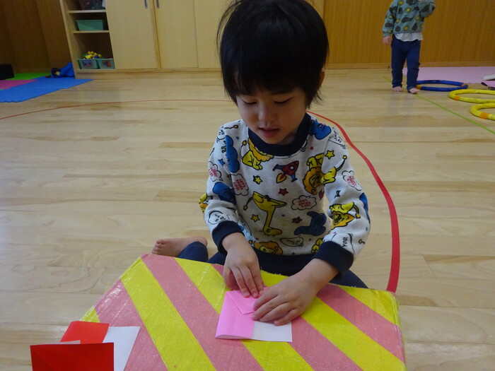 折り紙も折りました♪ 指先全集中!! “こうかなぁ?”“どのくらい折ったらいいの?”と 先生がするのを見て真似て折ってみましたよ! | ||