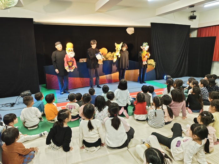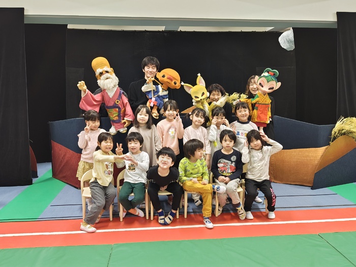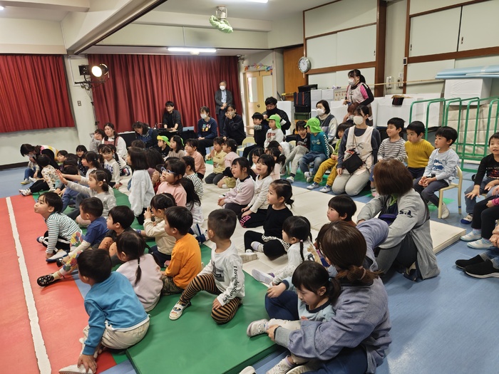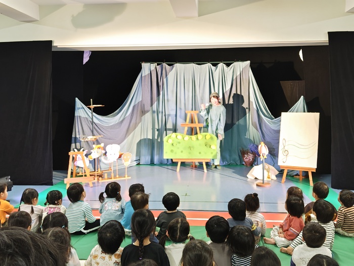 今年度は乳児クラス向けの「あら どこだ」と幼児向けの「小坊主ずいてん」のお話の2本立てでした。 人形や小道具に触れる時間もあり子ども達も先生も興味深でした。 「楽しかった~」と子ども達がにこにこ顔で話していました | ||