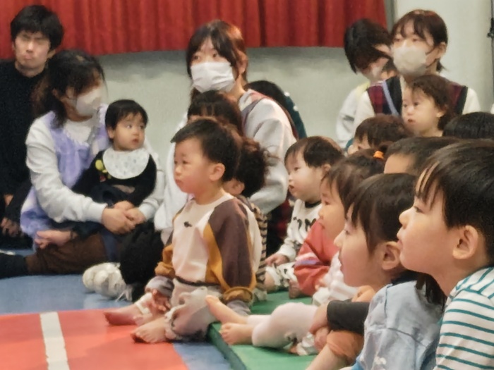 今年度はひよこ組のクラスも参加。人形をじっと見つめている姿が可愛らしかったです | ||