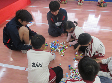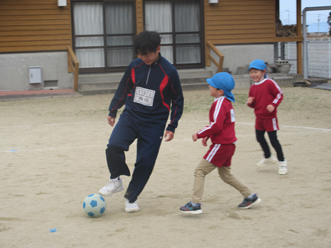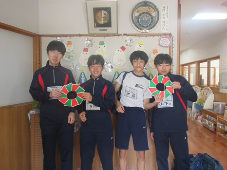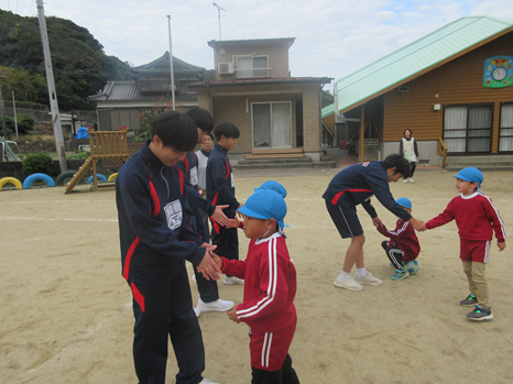 11日(木)、苓中3年生4名が来園し交流しました。りんご組さんのダンス「ウィーアー」を一緒に楽しみ、和んだところで自己紹介を!中学生が持参した手作りオモチャ(ボーリング・積み木)に大喜び。ルールを教えてもらうと何度も挑戦していました。大園庭では大好きなサッカーや鬼ごっこの相手をしてもらい、大満足の子ども達でした。 | ||